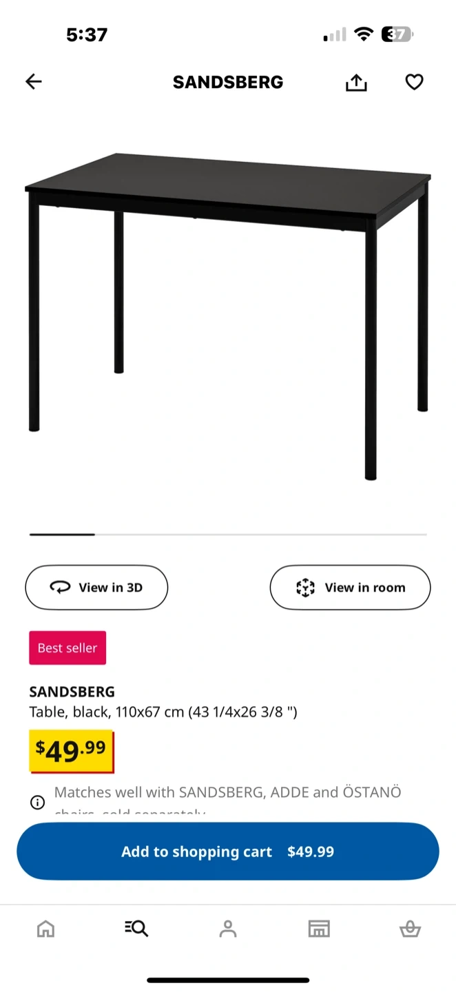 Selling a black IKEA SANDSBERG table. It's in great shape and ready for a new home! The dimensions are 110x67 cm (43 1/4x26 3/8 "). Originally bought for $49.99