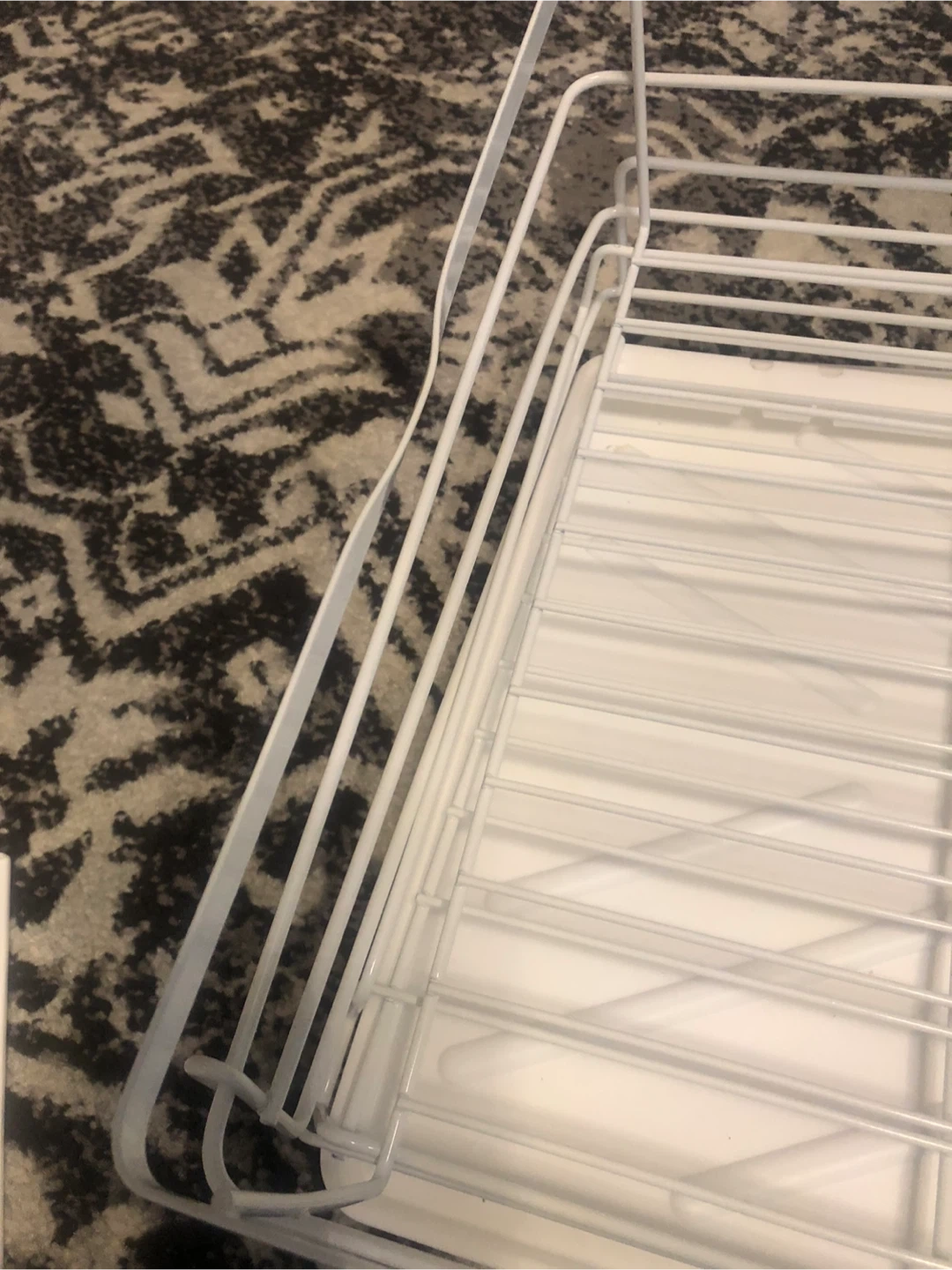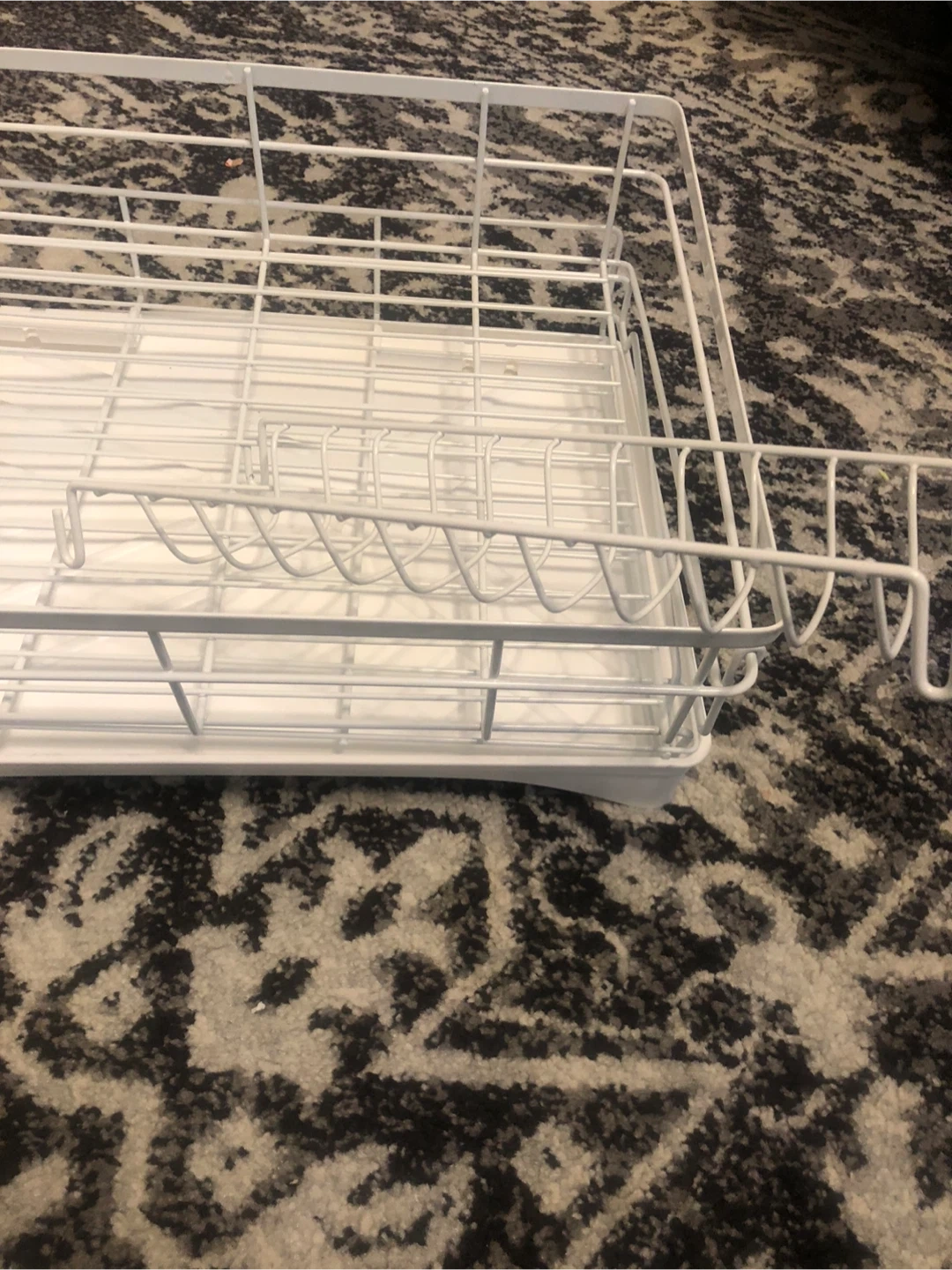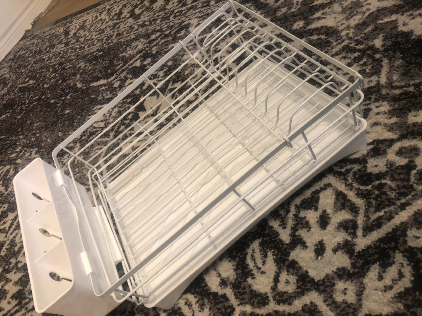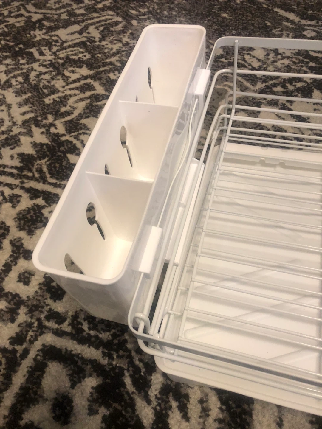 Selling a white dish rack in new condition. It's perfect for keeping your dishes organized and dry. It includes a utensil holder, making it super convenient for all your kitchen needs