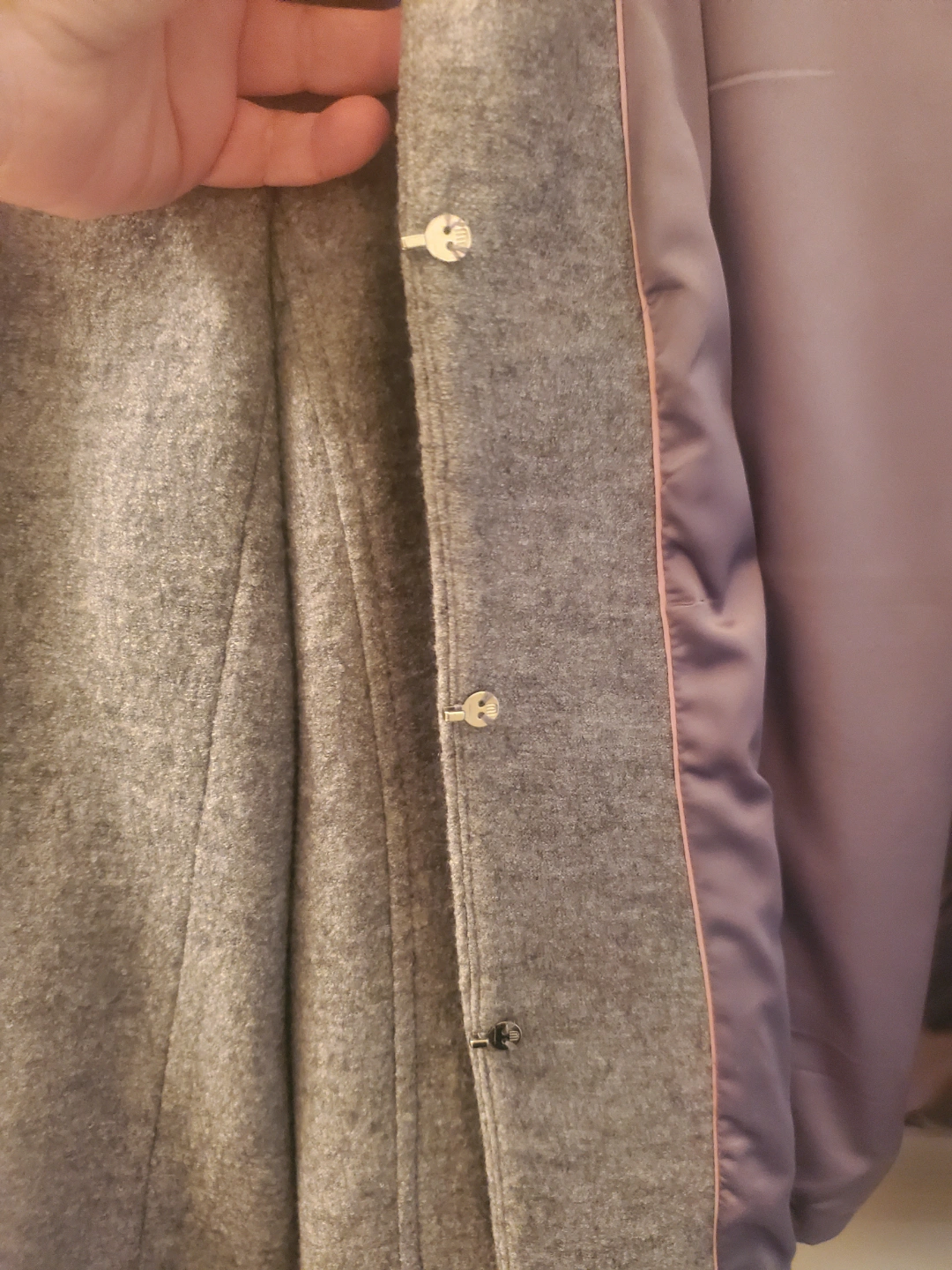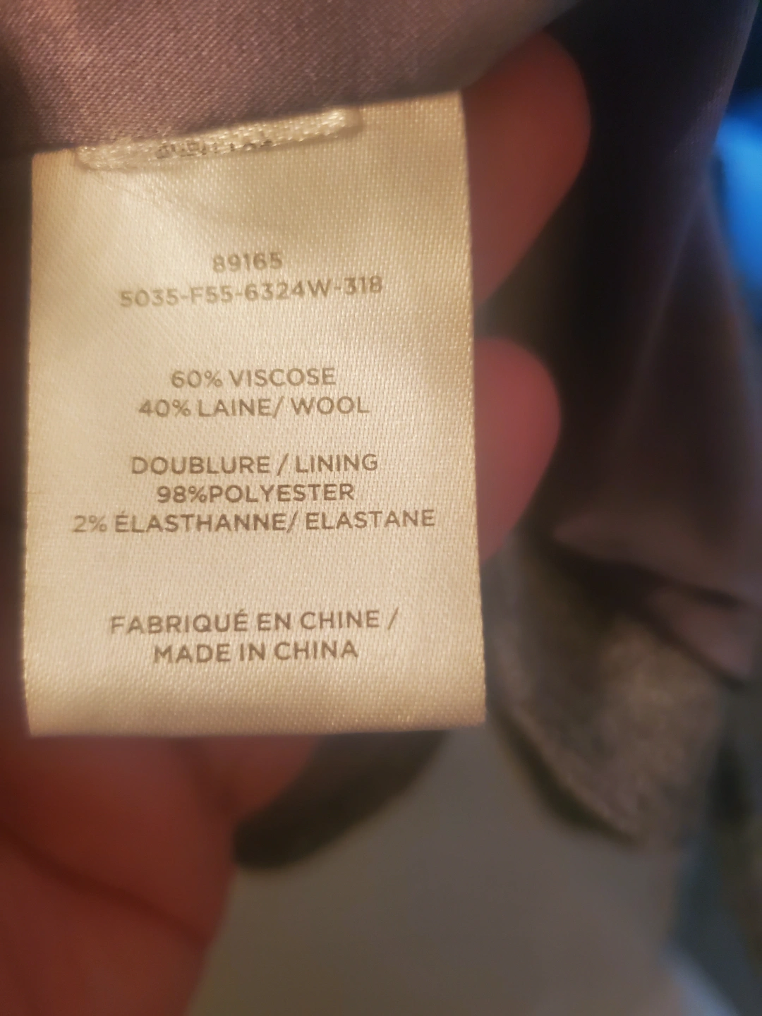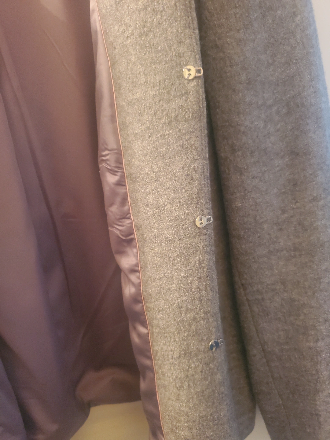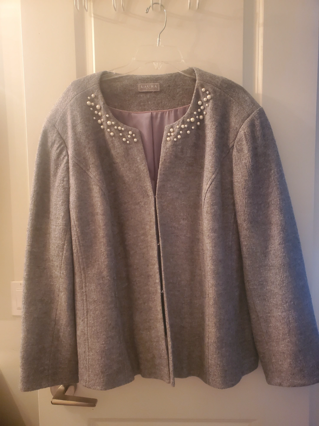 Selling a stylish Laura jacket, perfect for adding a touch of elegance to any outfit! The outer material is a blend of 60% viscose and 40% wool, providing a comfortable and warm fit. The lining is made of 98% polyester and 2% elastane. It is a beautiful grey colour with pearl detailing around the neckline