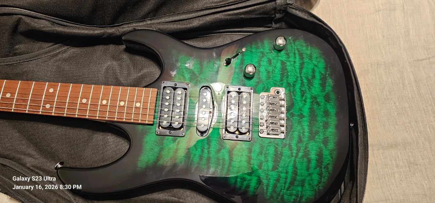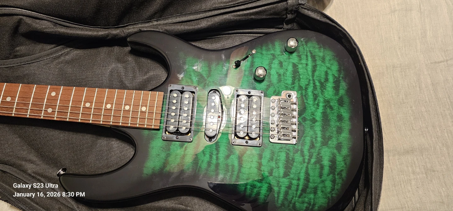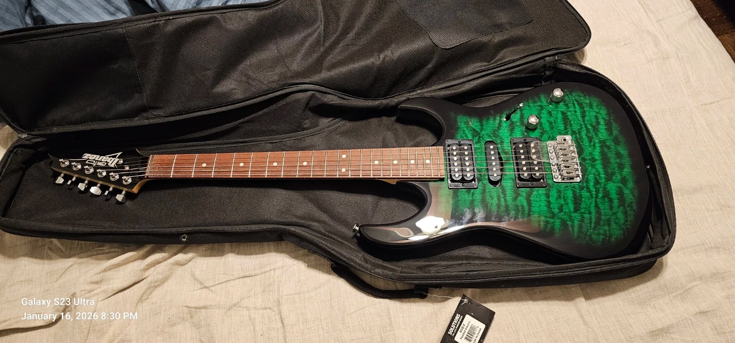 Selling an Ibanez GIO electric guitar in a cool green burst finish! Includes the guitar case, so it's ready to go for its next owner. Great for beginners or anyone looking for a reliable instrument.