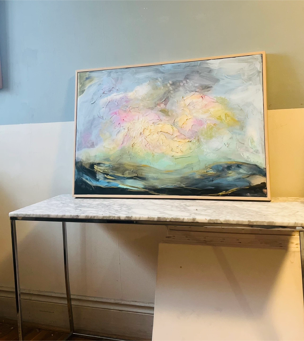 This is an abstract painting with a light beechwood tone frame. It has a mix of colours including blues, pinks, yellows and greys. It would look great in any room!