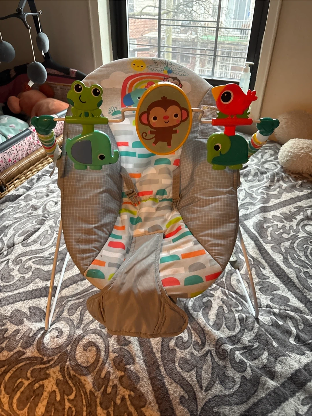 Selling a gently used baby bouncer seat! It features a toy bar with cute animal characters to keep your little one entertained. The seat is in good condition and ready for a new home. Perfect for infants and young babies