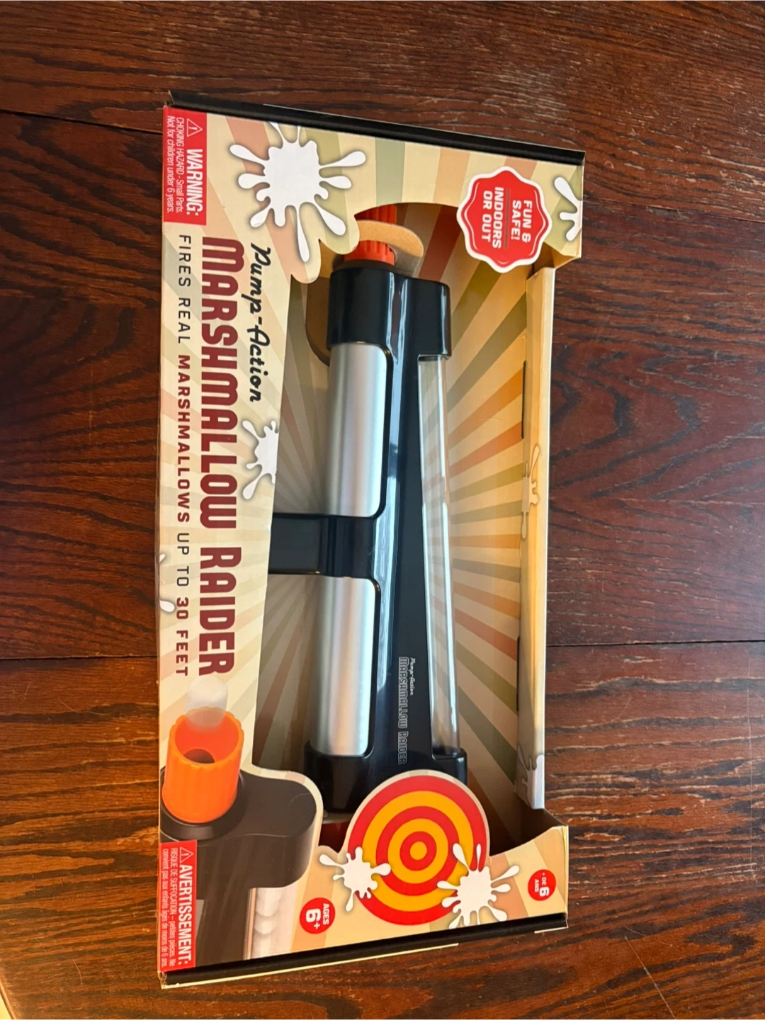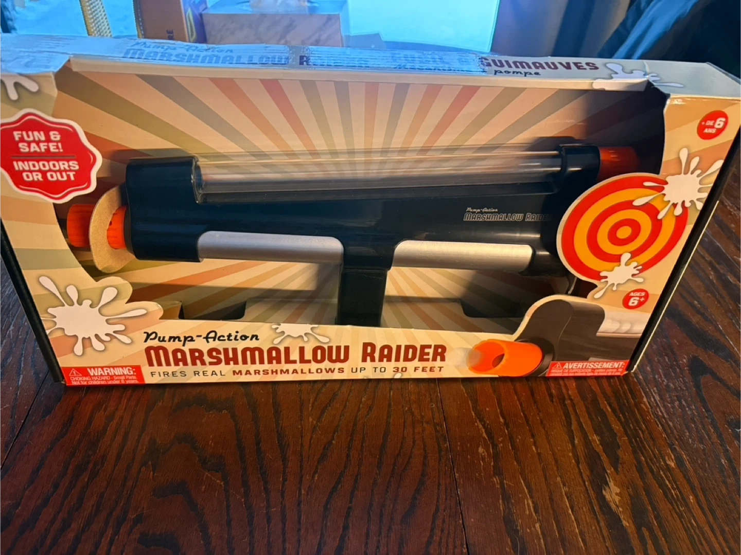 Selling a pump-action Marshmallow Raider toy! It fires real marshmallows up to 30 feet. It's fun and safe, and can be used indoors or out. Recommended for ages 6+