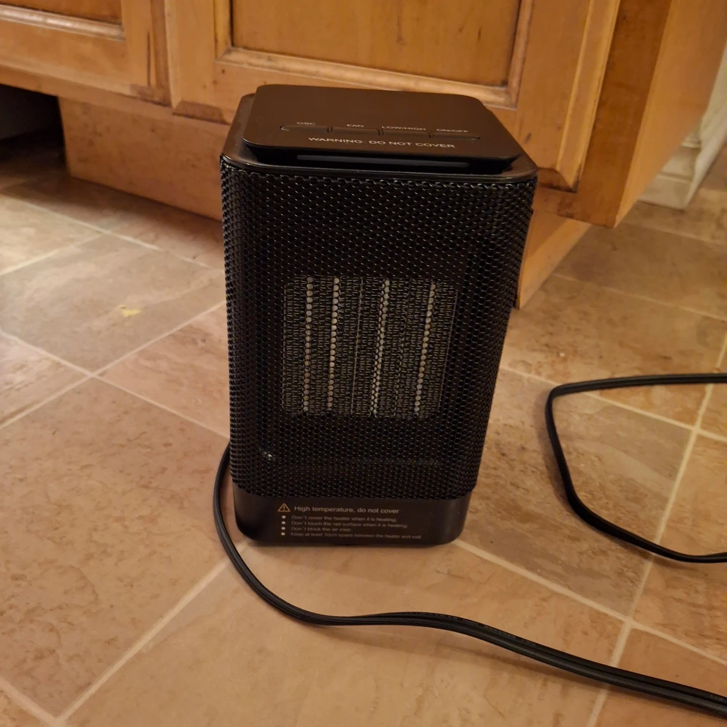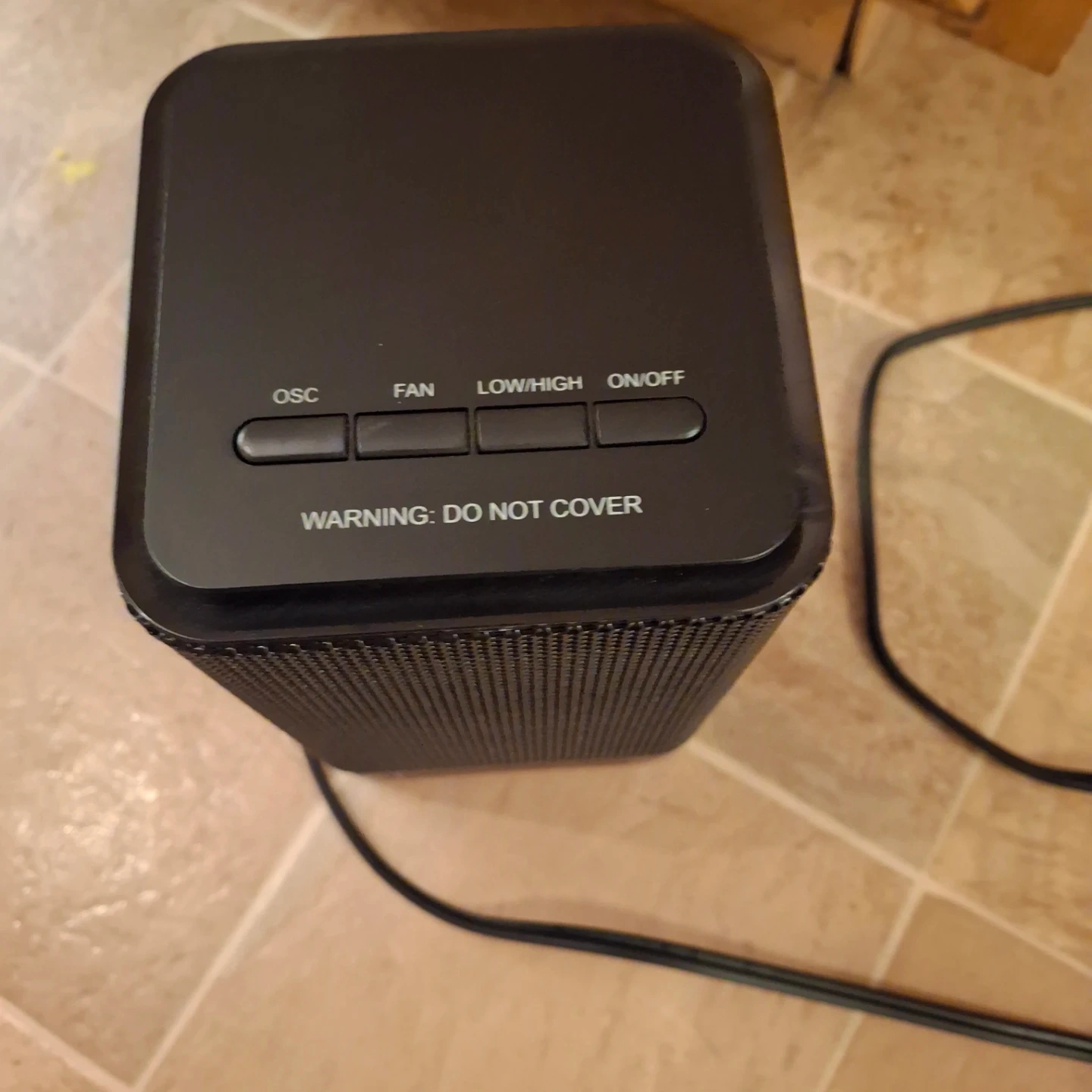 personal space heater in black. It has an OSC (oscillate) function, a fan setting, and a low/high heat setting. on/off switch. It's in like-new condition