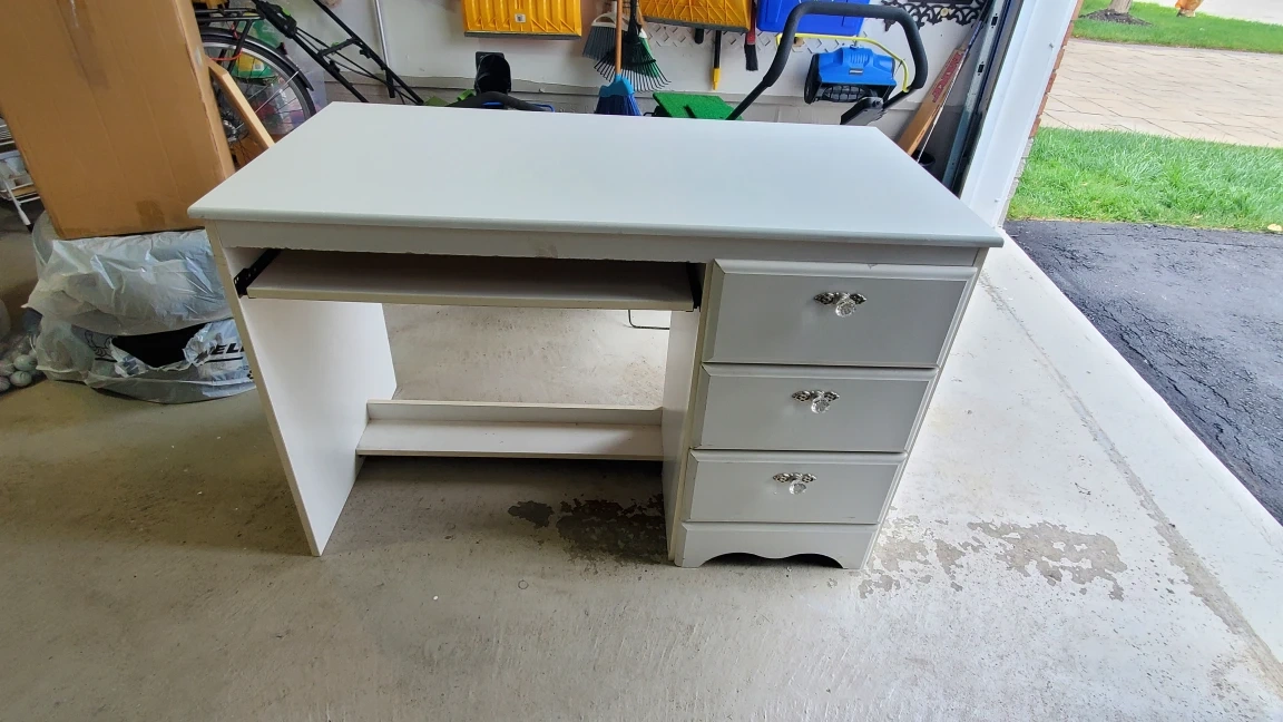 Selling a white vanity desk that’s in great shape! It features a smooth, clean surface and three drawers with decorative knobs. Perfect for a bedroom or home office setup