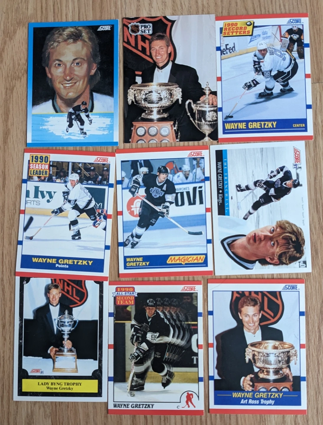 Selling a collection of vintage Wayne Gretzky hockey cards. These cards feature Gretzky with the LA Kings and highlight moments like the 1990 All-Star Second Team and his Art Ross Trophy win. A great addition for any hockey card collector!