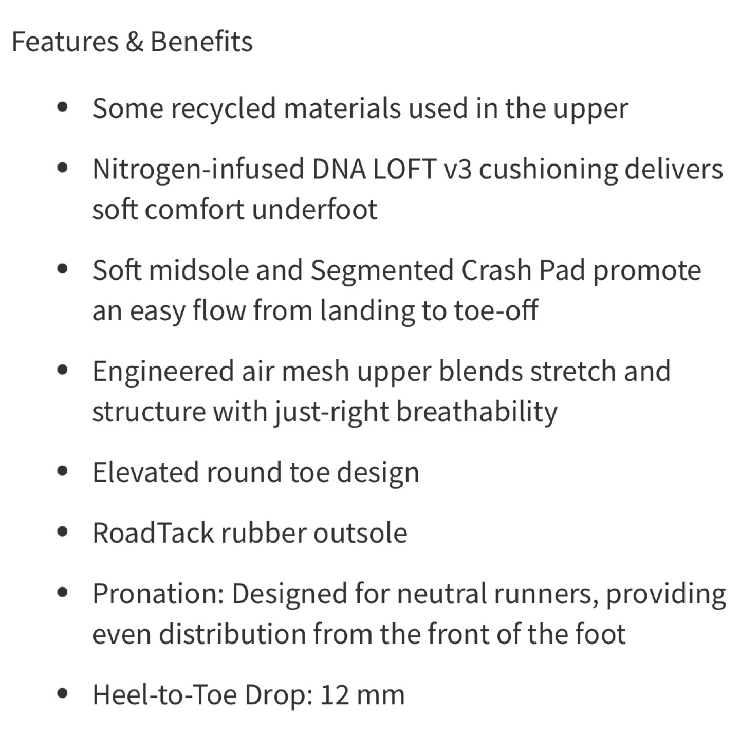Lightweight and cushioned neutral running shoes featuring DNA LOFT v3 cushioning, breathable engineered mesh upper, and durable RoadTack rubber outsole. Comfortable, supportive, and great for everyday runs or walking.