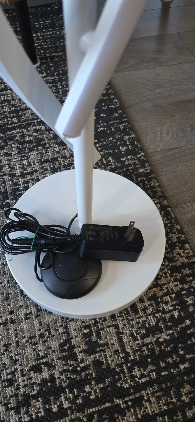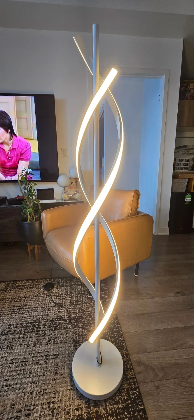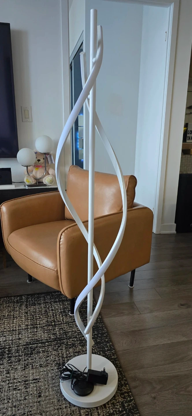 Selling a modern LED Dimmable spiral floor lamp in white. It's a stylish piece that adds a unique touch to any room. The lamp comes with its original components, including the charger and instructions. Perfect for adding some ambient lighting to your space