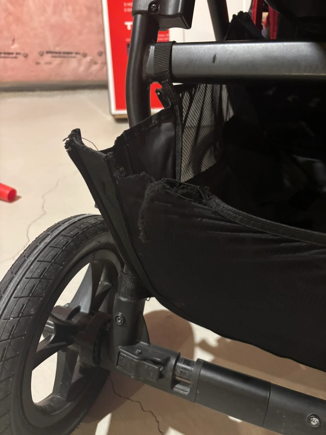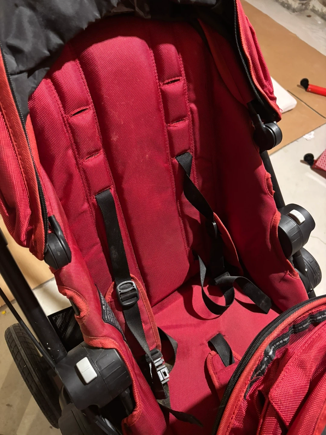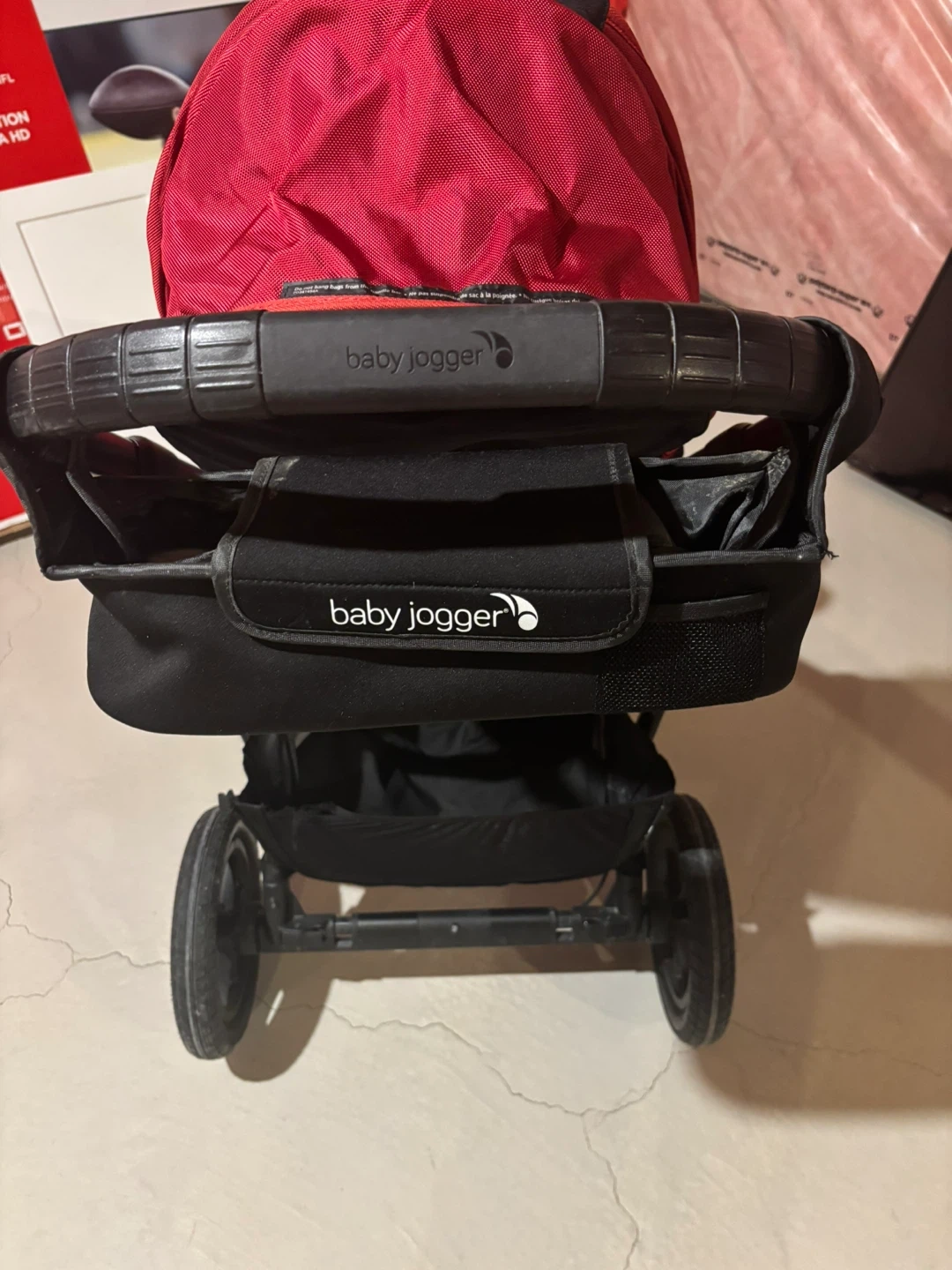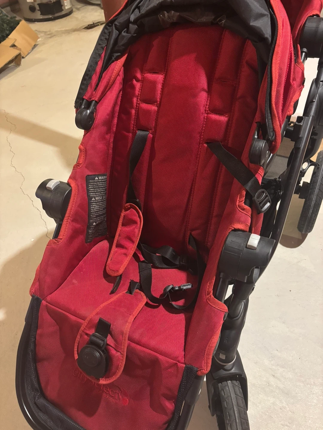 Selling a Baby Jogger City Select double stroller in red. The stroller has some wear and tear, particularly on the bottom basket, but it's still functional for getting around with two little ones. Please see the photos for details on the condition.