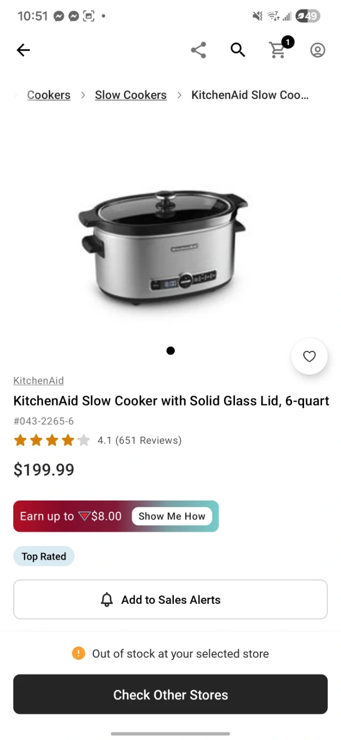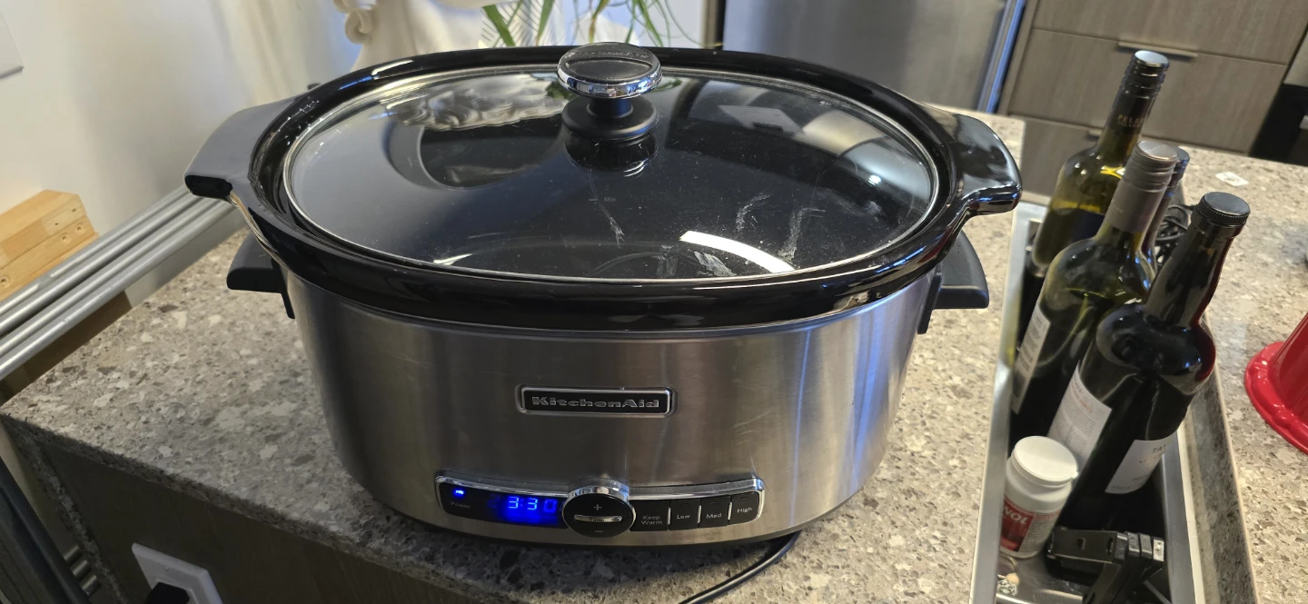 I'm selling a KitchenAid Slow Cooker with a solid glass lid. It's a 6-quart size, perfect for cooking meals for the whole family! Originally bought for $199.99