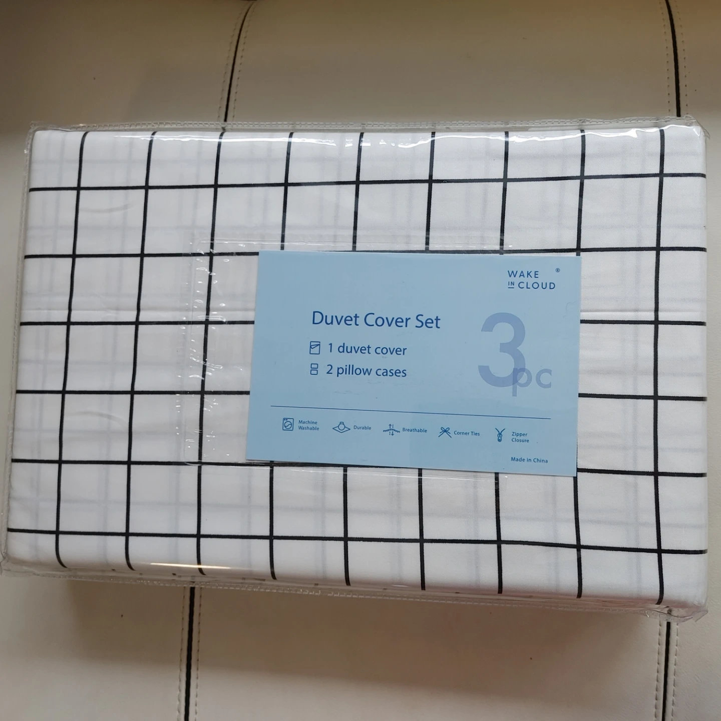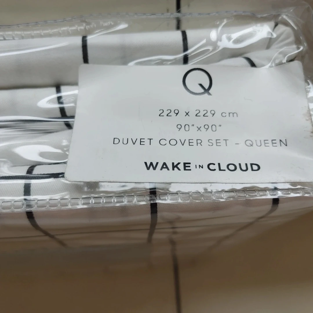 This is a brand new Wake In Cloud duvet cover set in queen size! It includes one duvet cover and two pillow cases. The dimensions are 90" x 90". It's machine washable, durable, and breathable, with corner ties and a zipper closure. Comes in original packaging