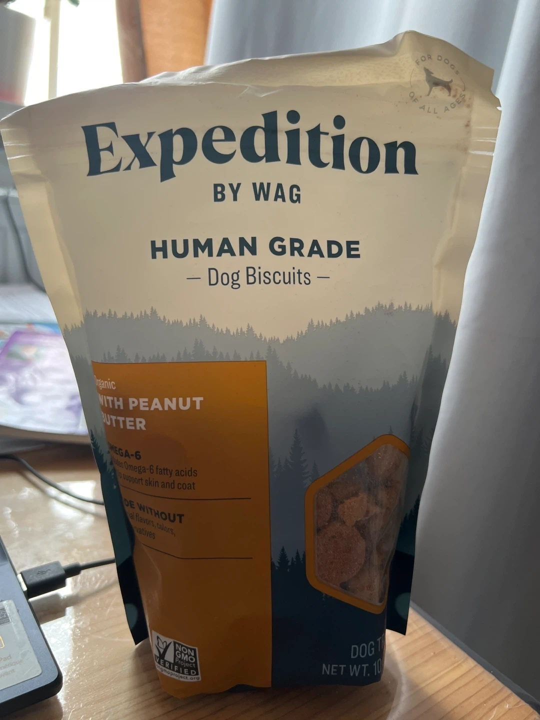 Selling a bag of Expedition by Wag Human Grade Dog Biscuits! These organic dog biscuits are made with peanut butter and contain Omega-6 fatty acids to support your dog's skin and coat. They're made without artificial flavors, colors, and preservatives. Net weight is 10 oz