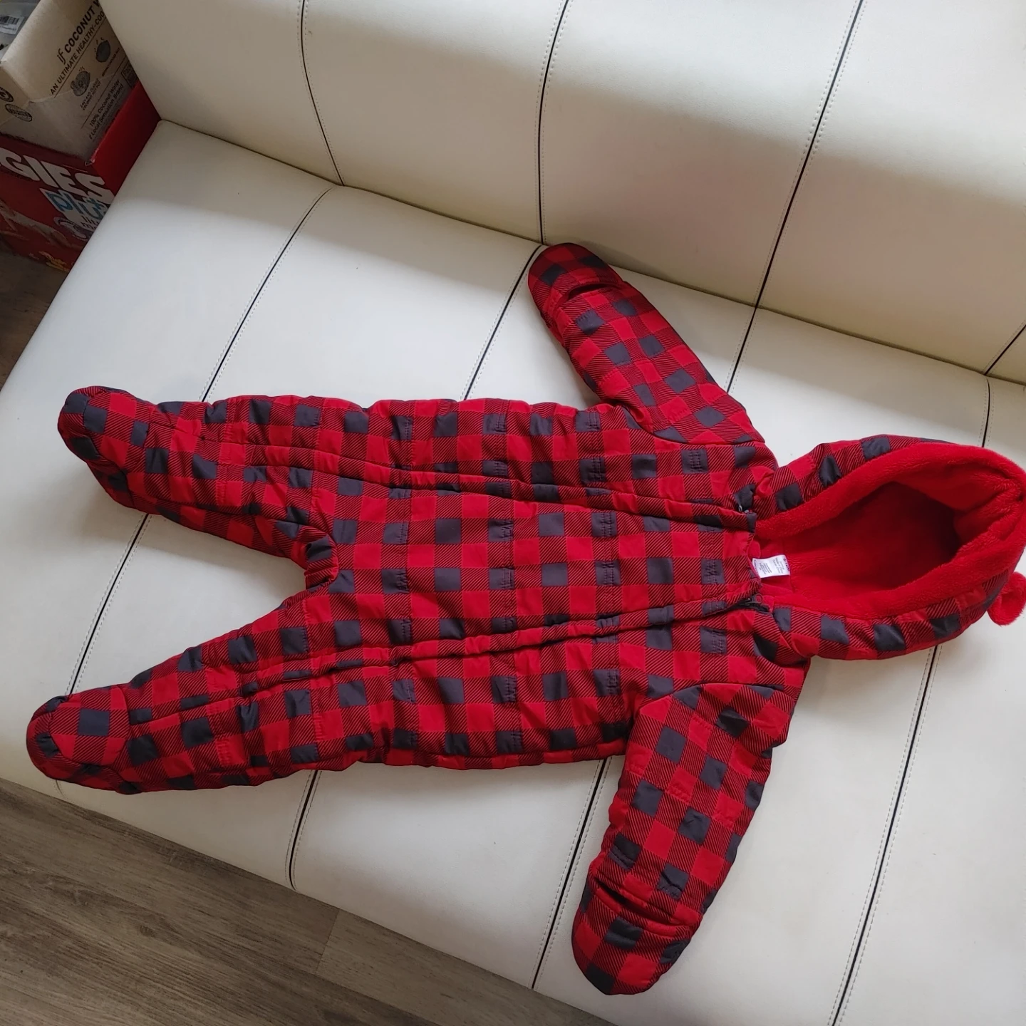 Snuggly red and black plaid snowsuit to keep your little one warm this winter! It's in great condition and ready for snowy adventures