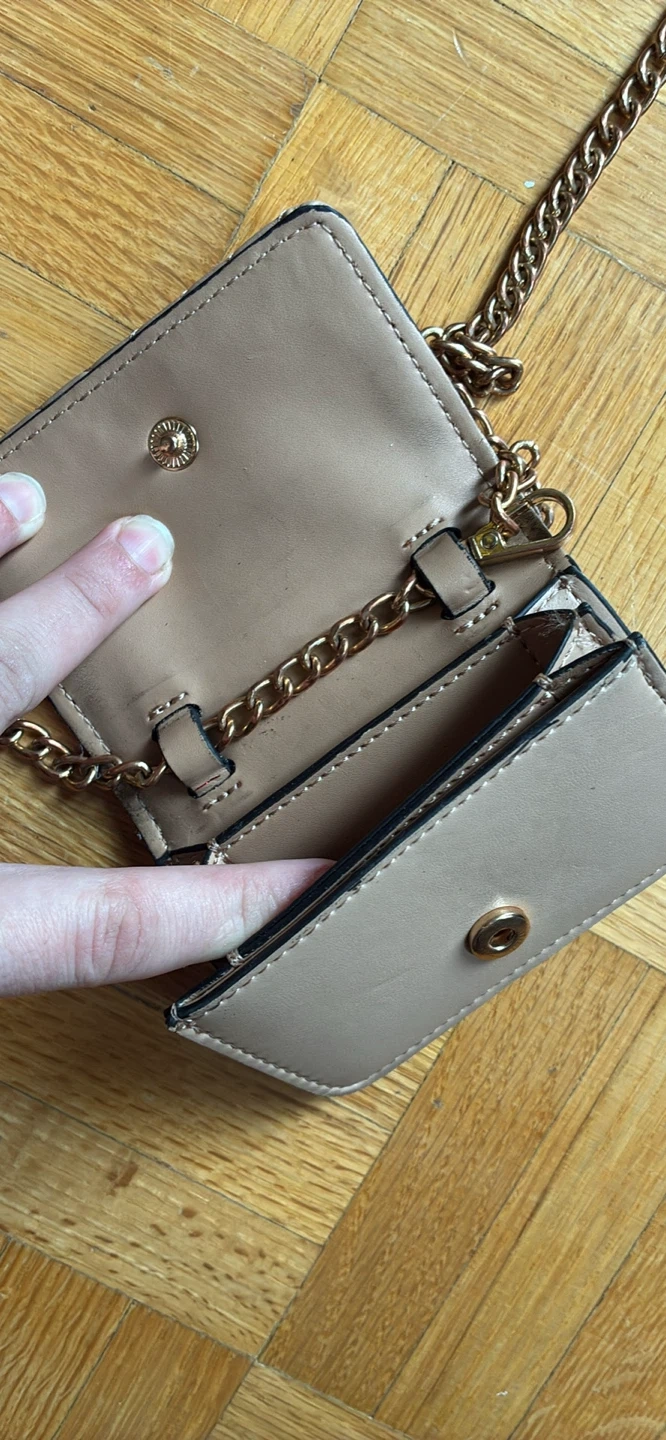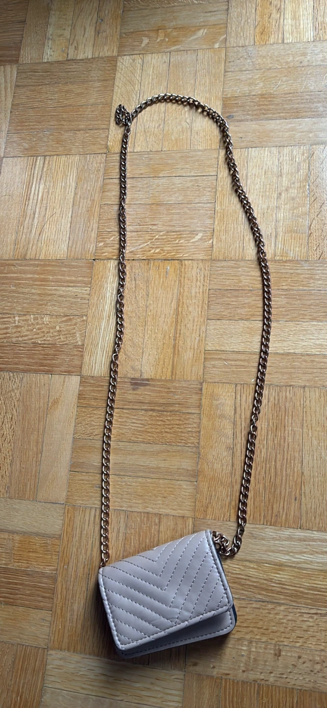 I'm selling a beige crossbody bag from Zara! It has a chevron pattern on the front and a gold chain strap. It's perfect for carrying your essentials when you're on the go