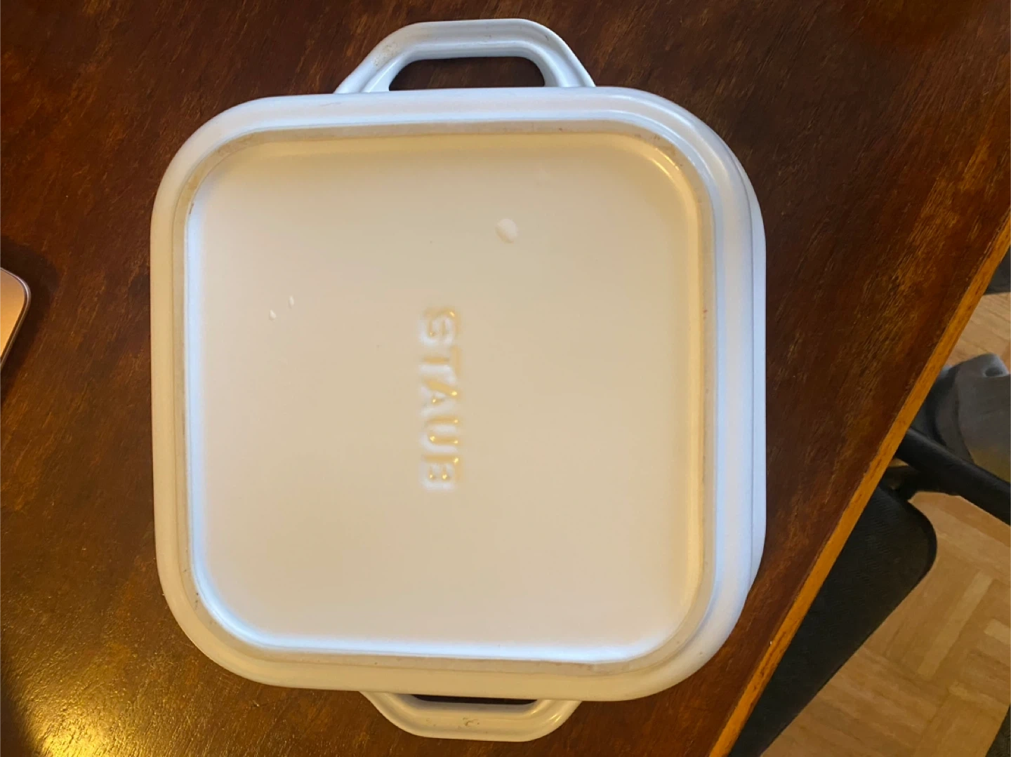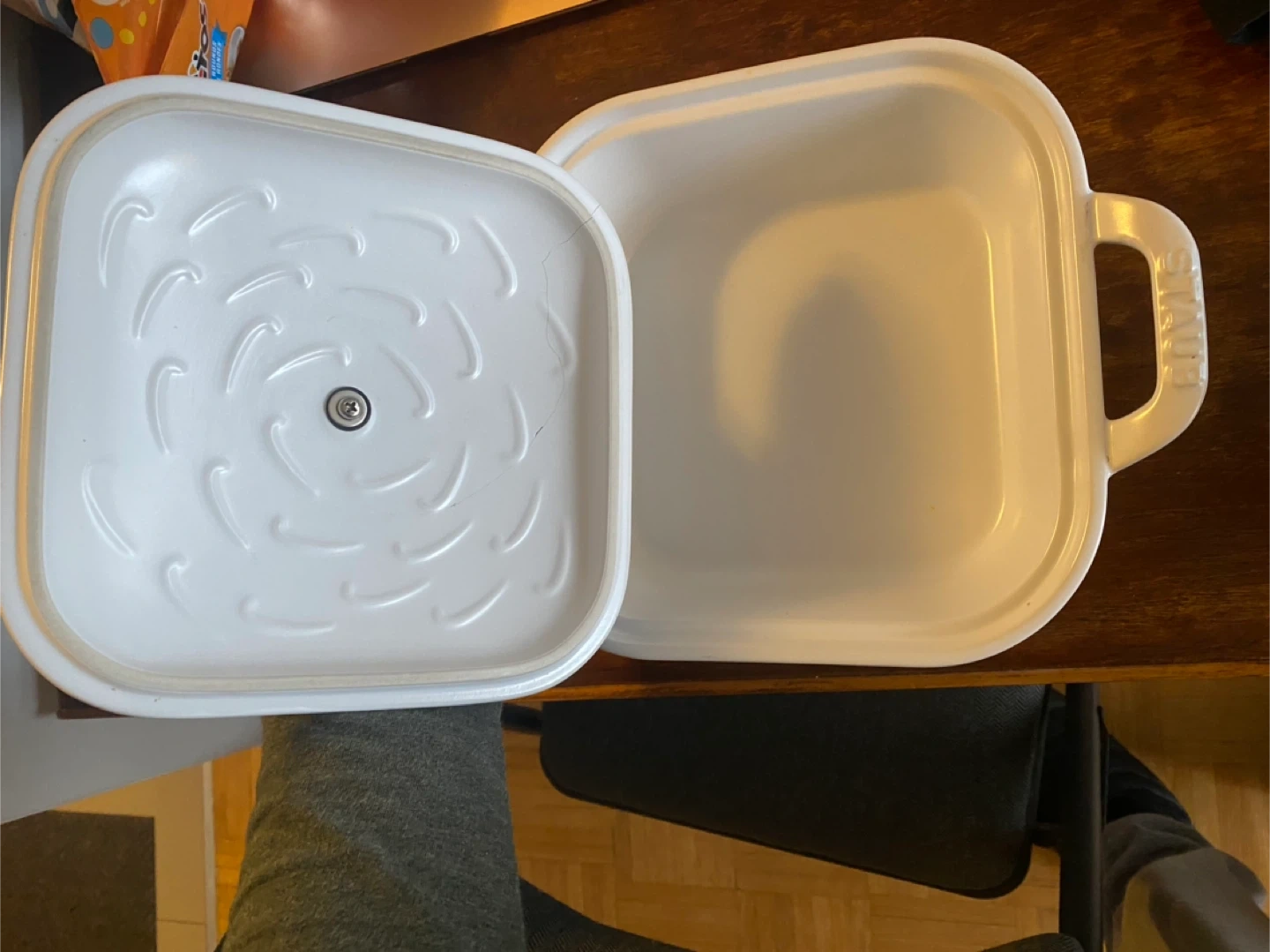 Selling a Staub square Dutch oven in white. There are some visible cracks on the enamel, as shown in the pictures, but it's still a great piece for cooking! Only used once. It's perfect for stews, roasts, and baking