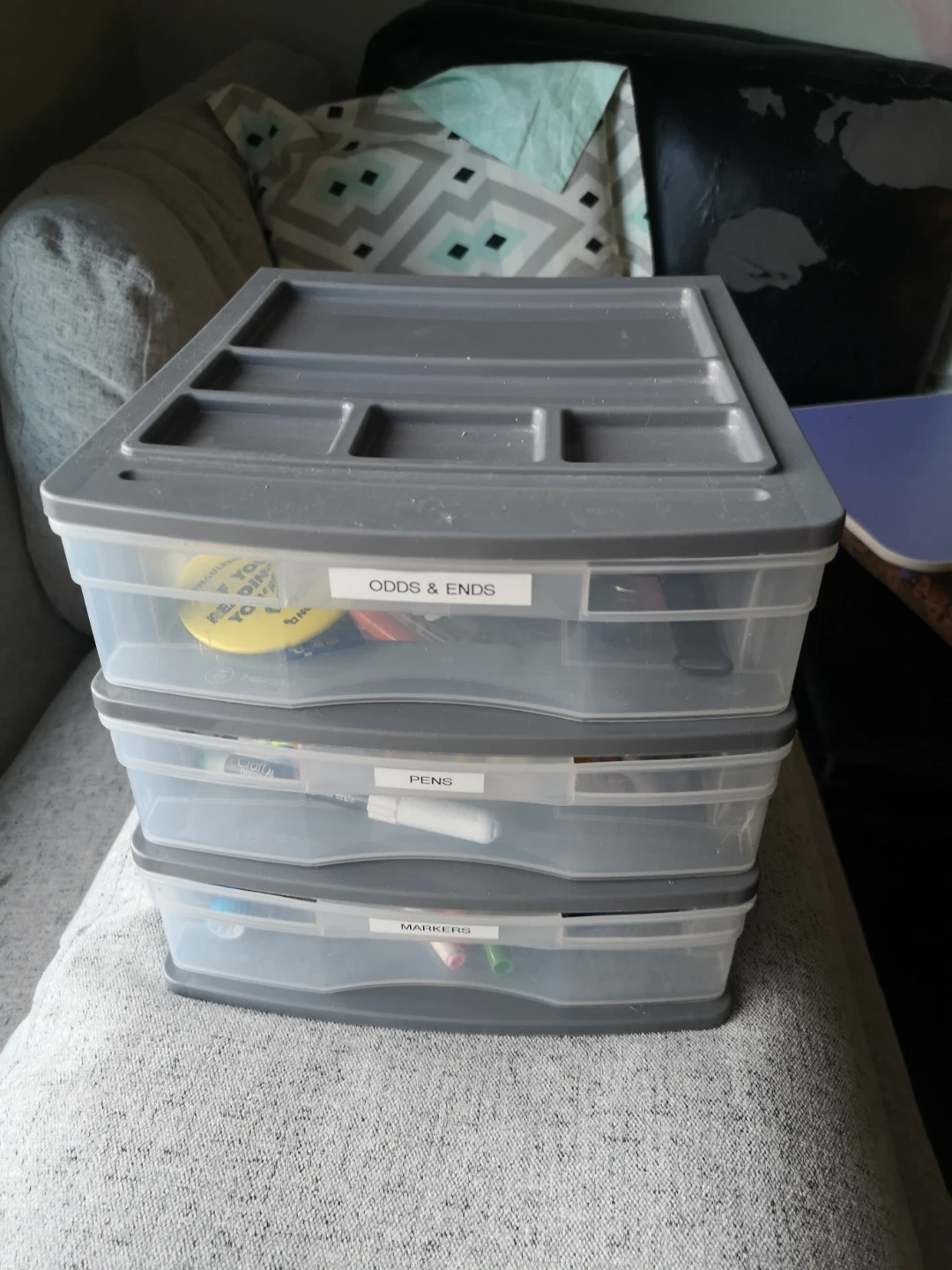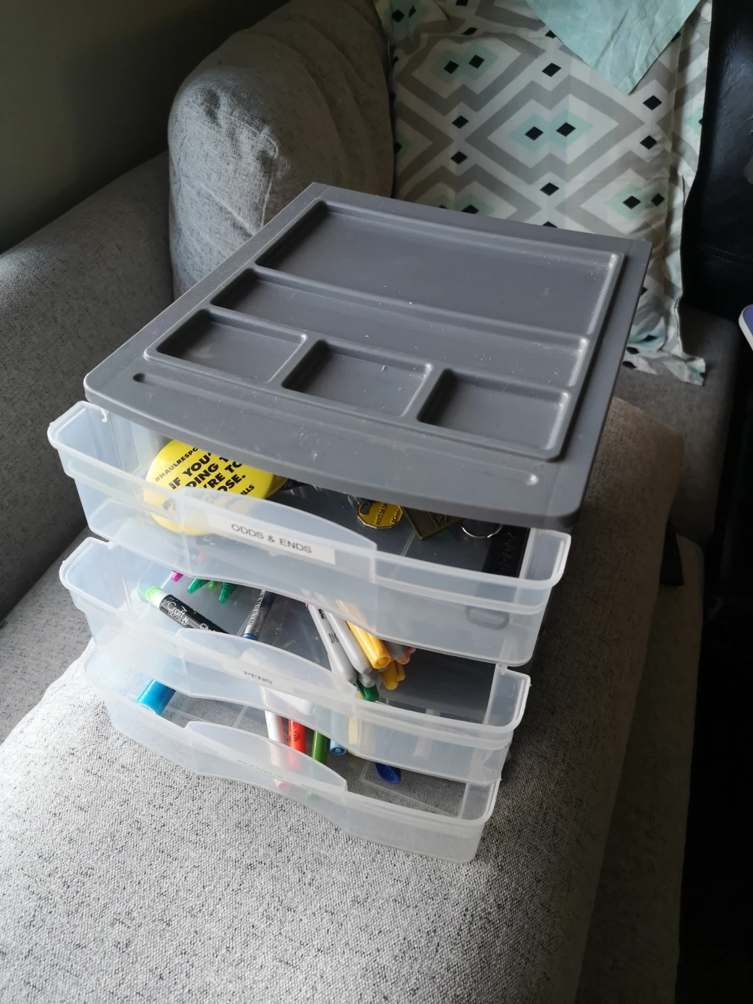 Selling a like-new, three-drawer organizer! It's perfect for storing your odds and ends, pens, markers, or whatever you need to keep tidy. The drawers are clear so you can easily see what's inside, and the top has a tray with compartments for even more organization. Great for home or office!