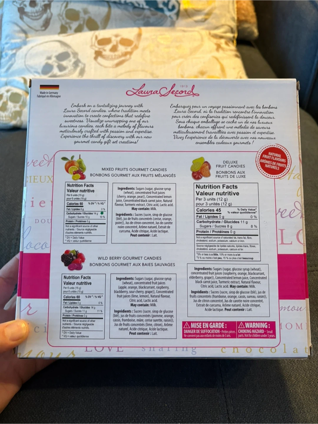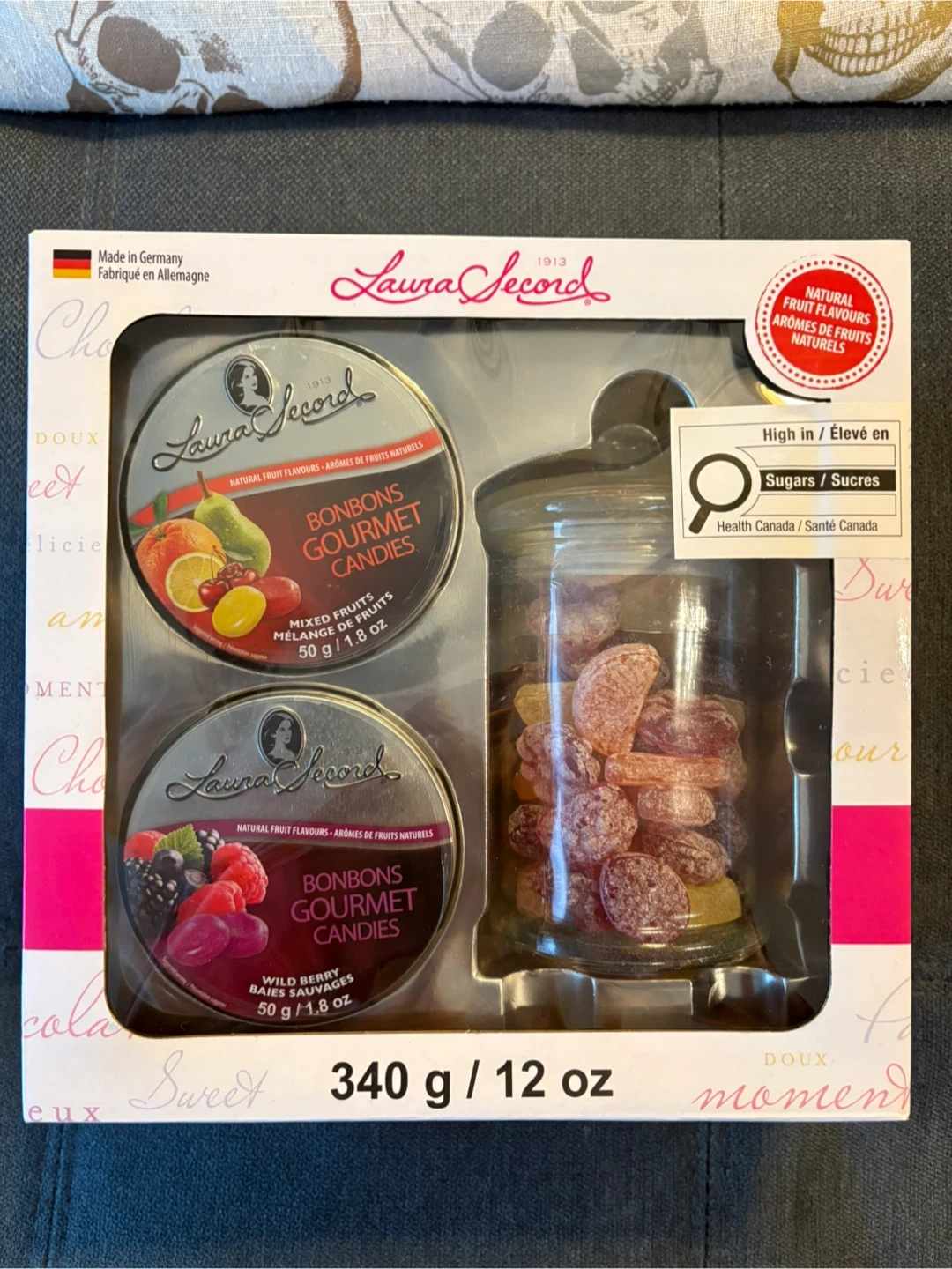 Hard candies brand new unopened. 340g. 12oz. Comes with a glass jar with a lid and two round metal tins. I’ve tried these before and they are very delicious. Retails for $40 at Metro. Pickup near Sherbourne and Adelaide St East or sometimes at some TTC stations.