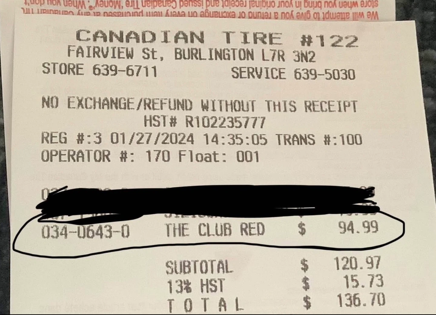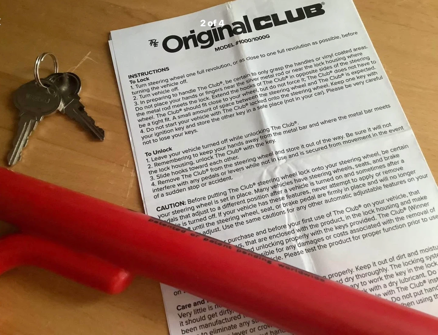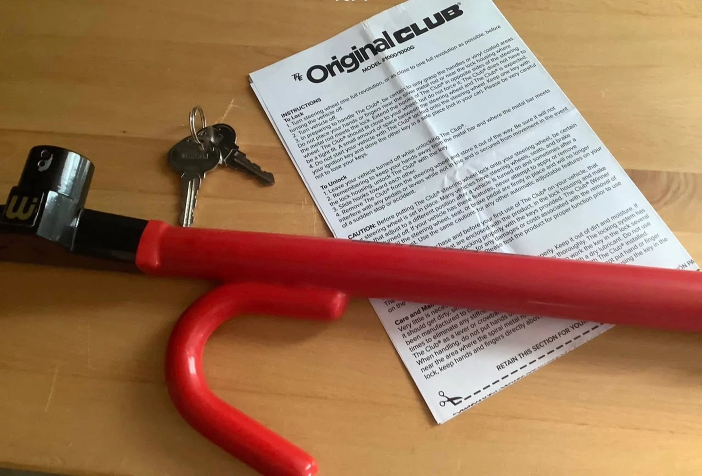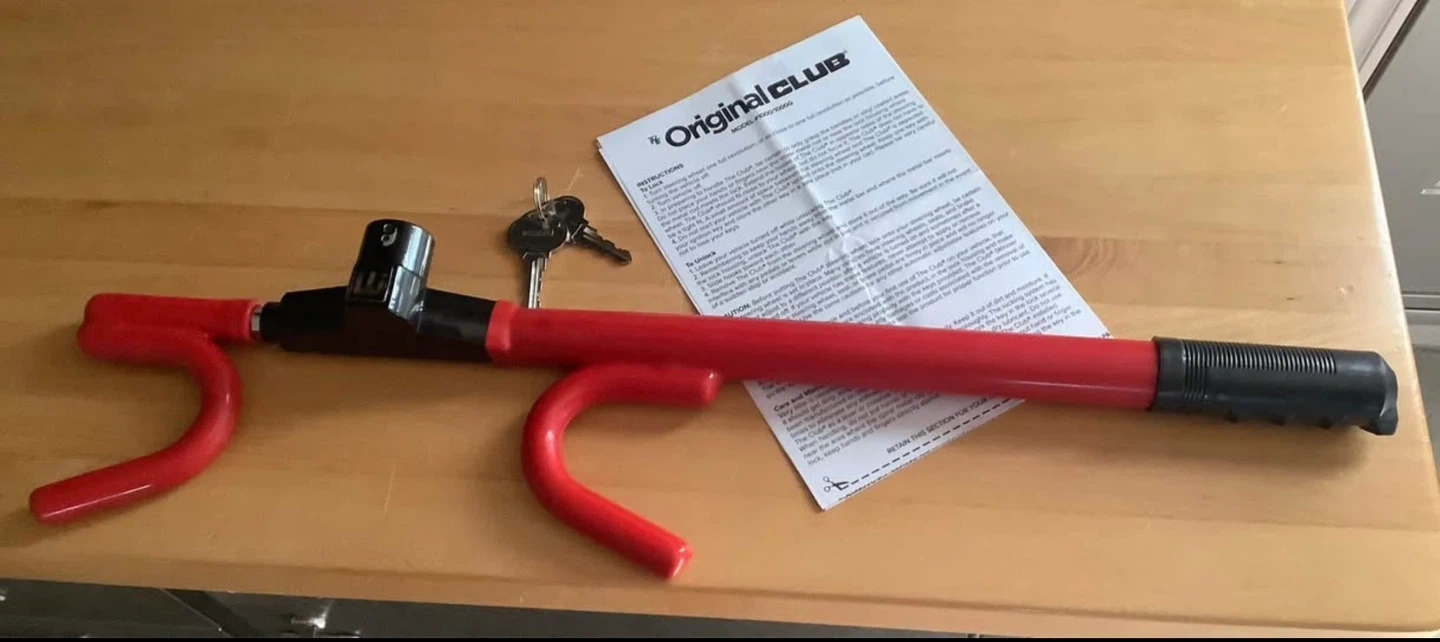 Selling a The Original Club steering wheel lock in red. It comes with the original instructions and 2 keys. Originally bought for $95 plus txs at Canadian Tire see pics for proof of receipt