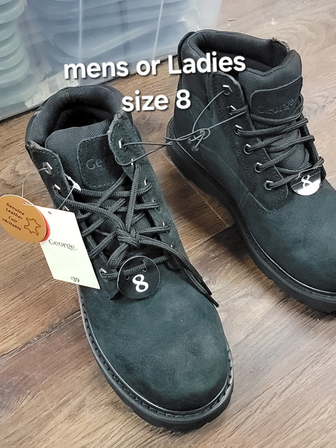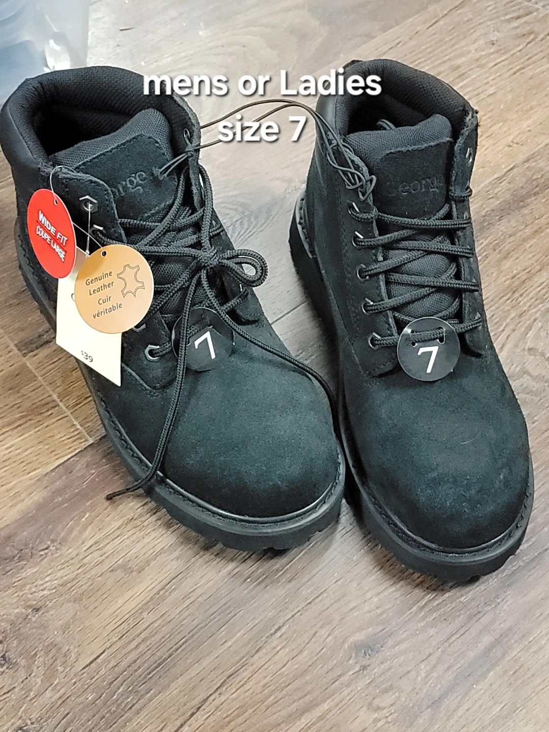 Selling a pair of George black boots, suitable for both ladies and men. They're size 8 and made with genuine leather. A great find for anyone needing sturdy and stylish footwear!