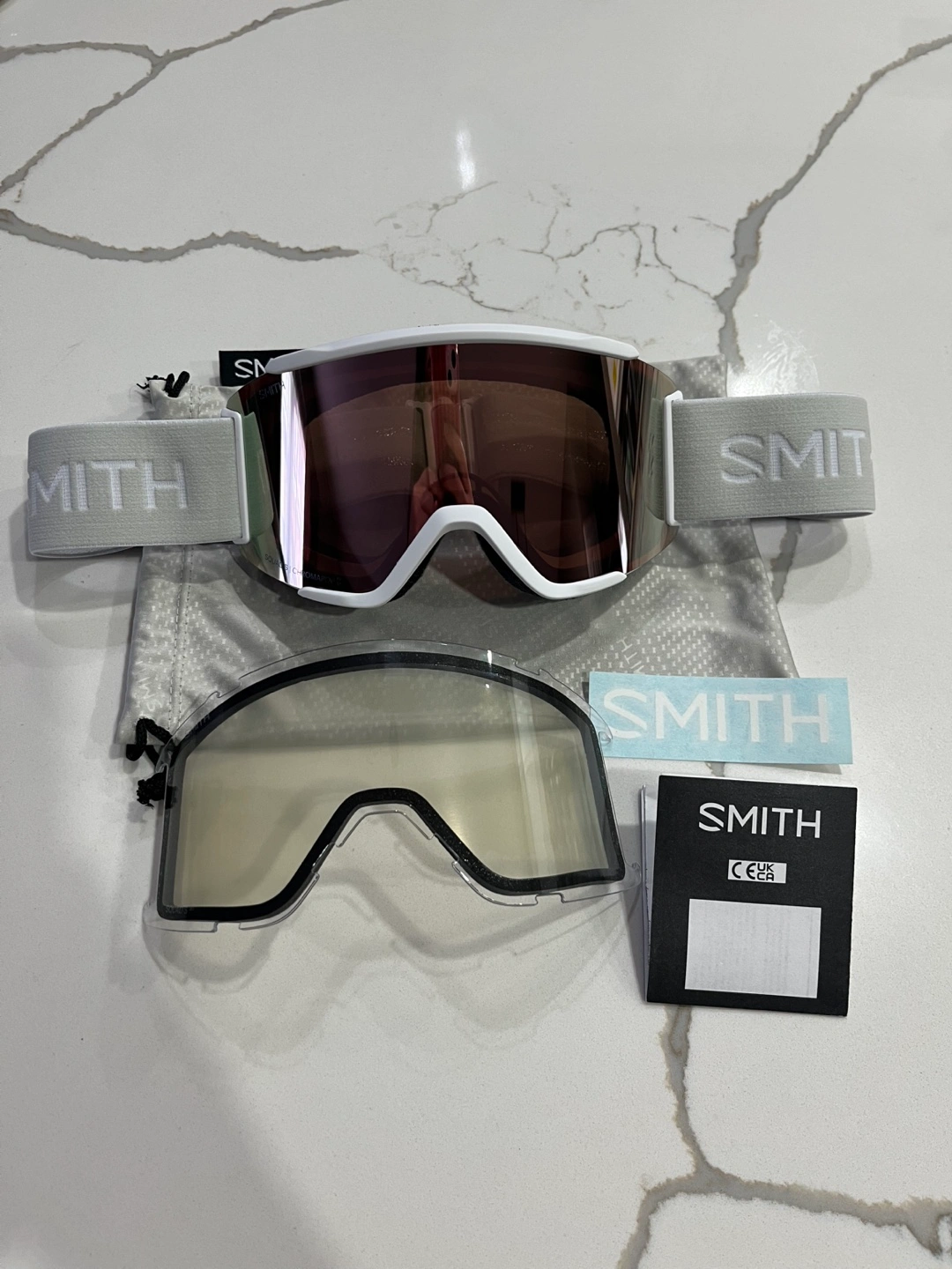 Selling a pair of Smith Squad S goggles in White Vapor with ChromaPop Everyday Rose lenses.