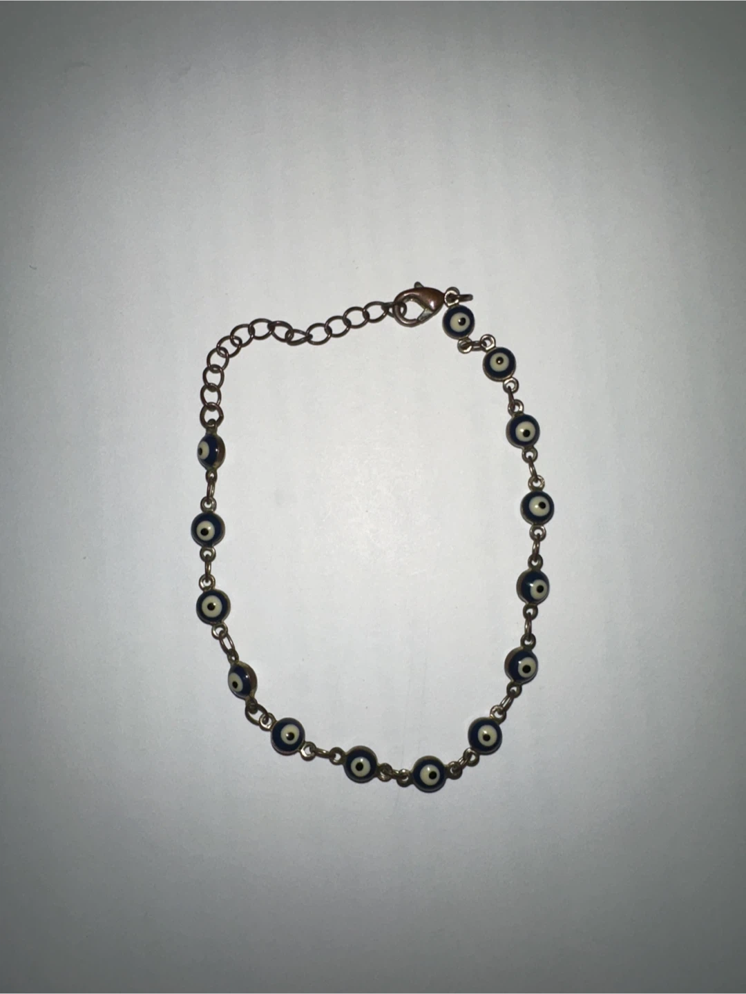 Selling a cute evil eye bracelet! It features small, round beads with the evil eye design, connected by a delicate chain. It's perfect for adding a touch of protection and style to any outfit