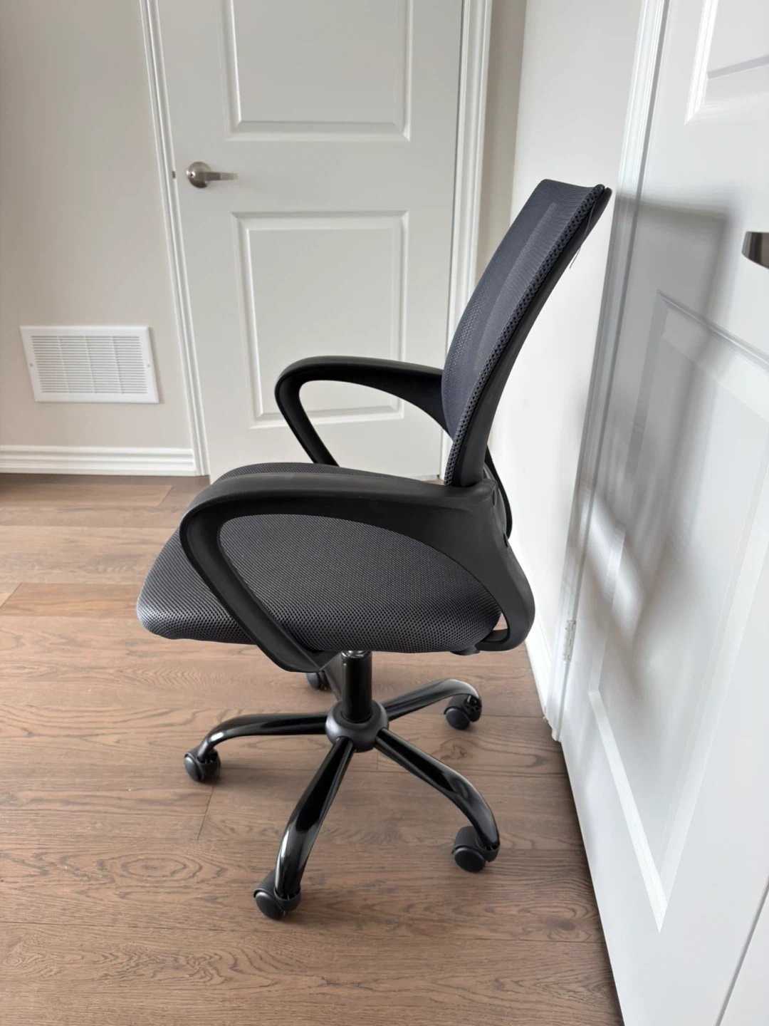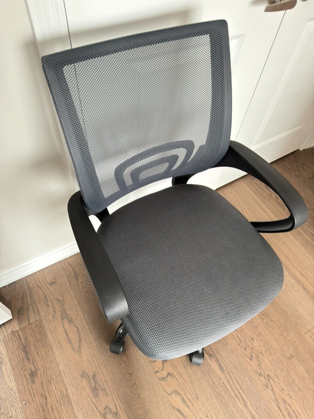 Selling a comfortable office chair with a black mesh back and seat. It's in great condition and perfect for working from home or studying. The chair has adjustable height and armrests for optimal comfort