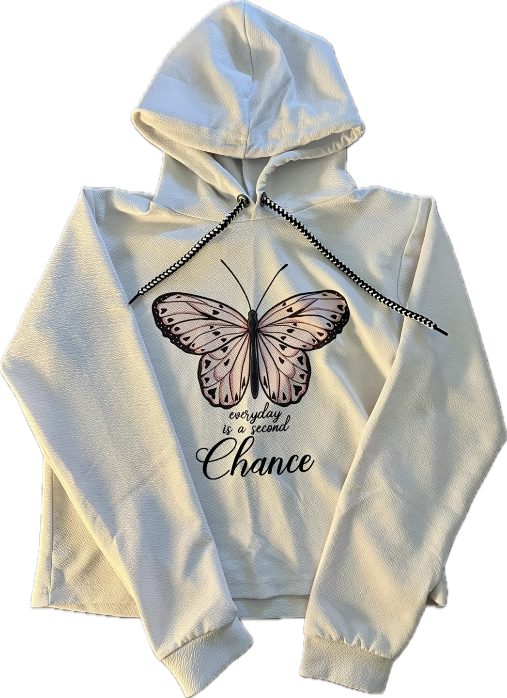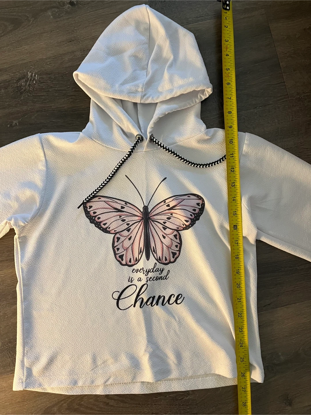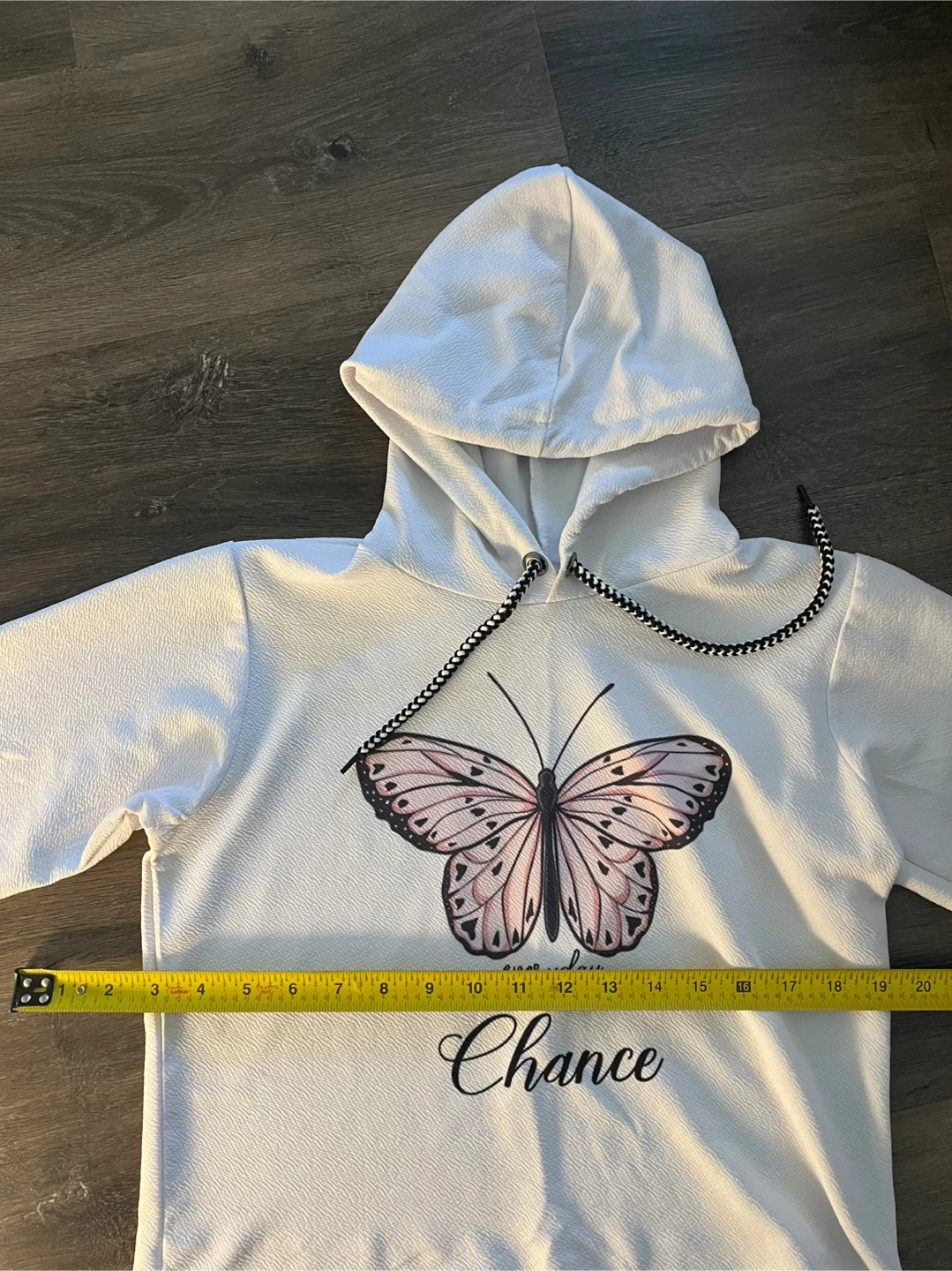 Selling a Mishi House hoodie featuring a butterfly design! It's a size XL and has a cute, casual look. The hoodie is white with black and white drawstring.