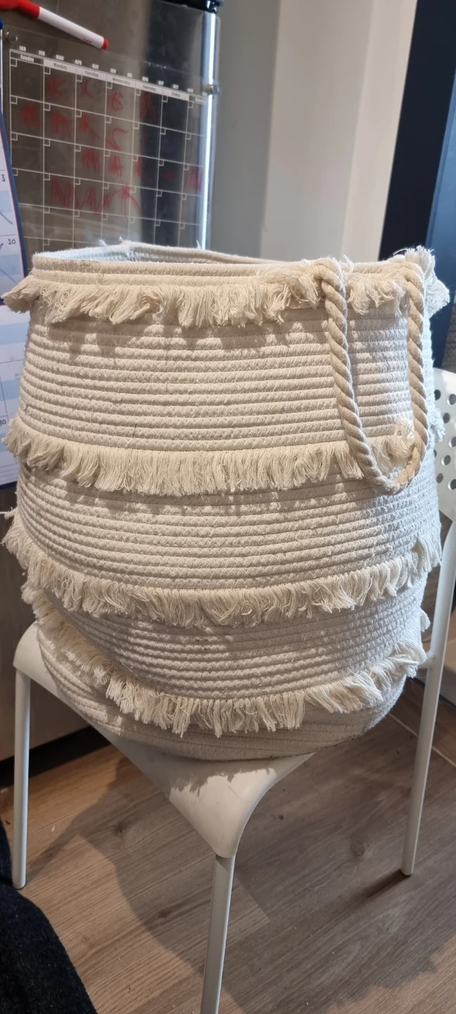 Here's a cute rope basket with a fringe design! It's in great shape and would be perfect for storage or decor