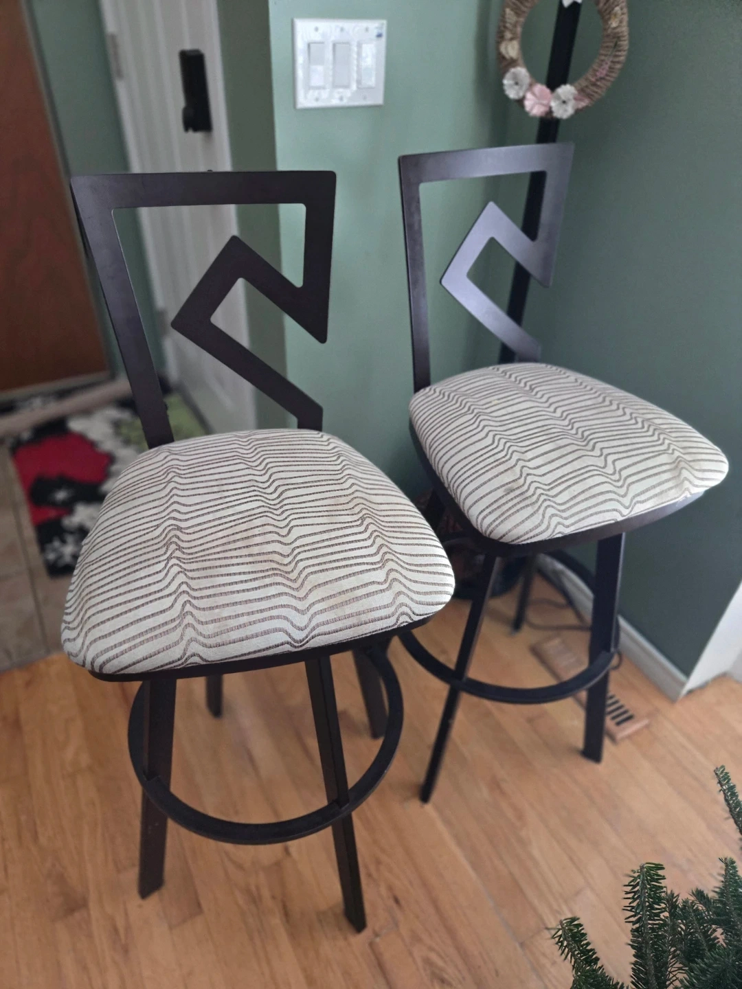 Two bar stools in good condition. They are mostly metal except the cushions. They swivel as well.