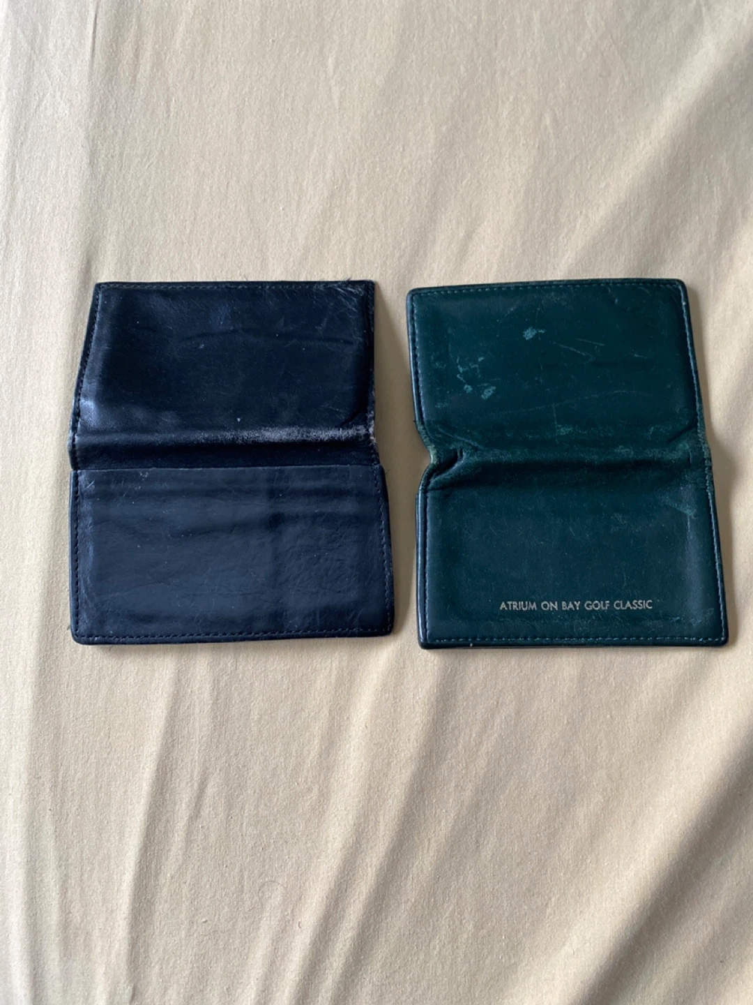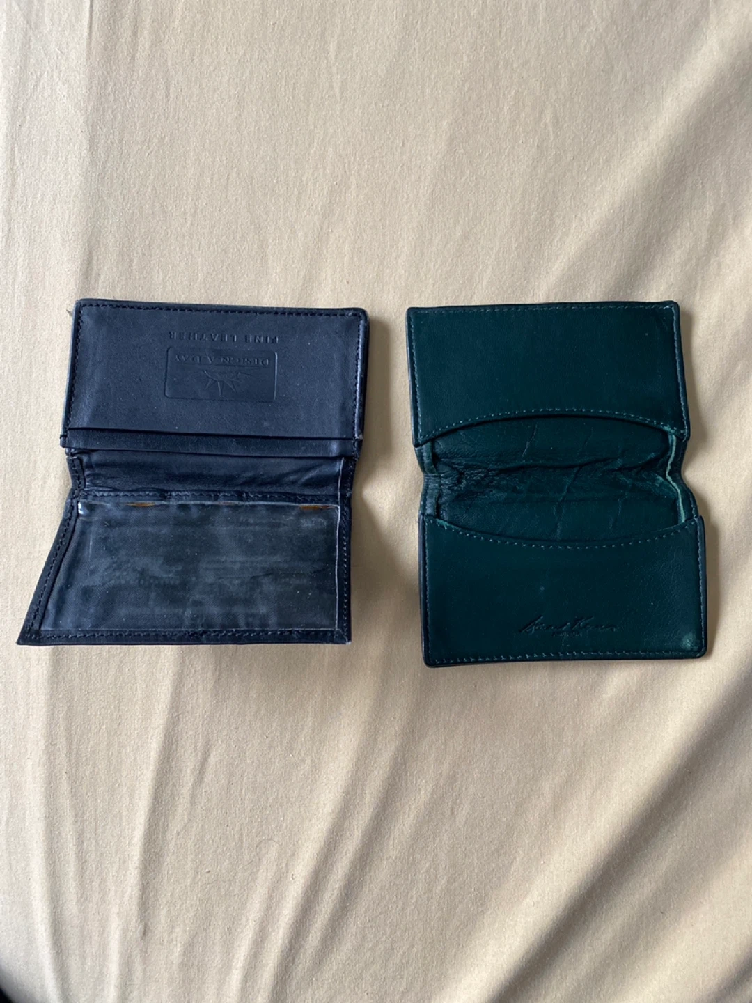 Selling two leather wallets. One is black leather and the other is green leather. Black one has 4 compartments. Green one has 2.