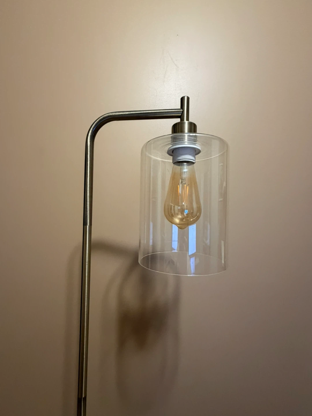 Add a touch of modern elegance to your space with this sleek bronze floor lamp! It features a clear glass shade and a convenient foot switch.