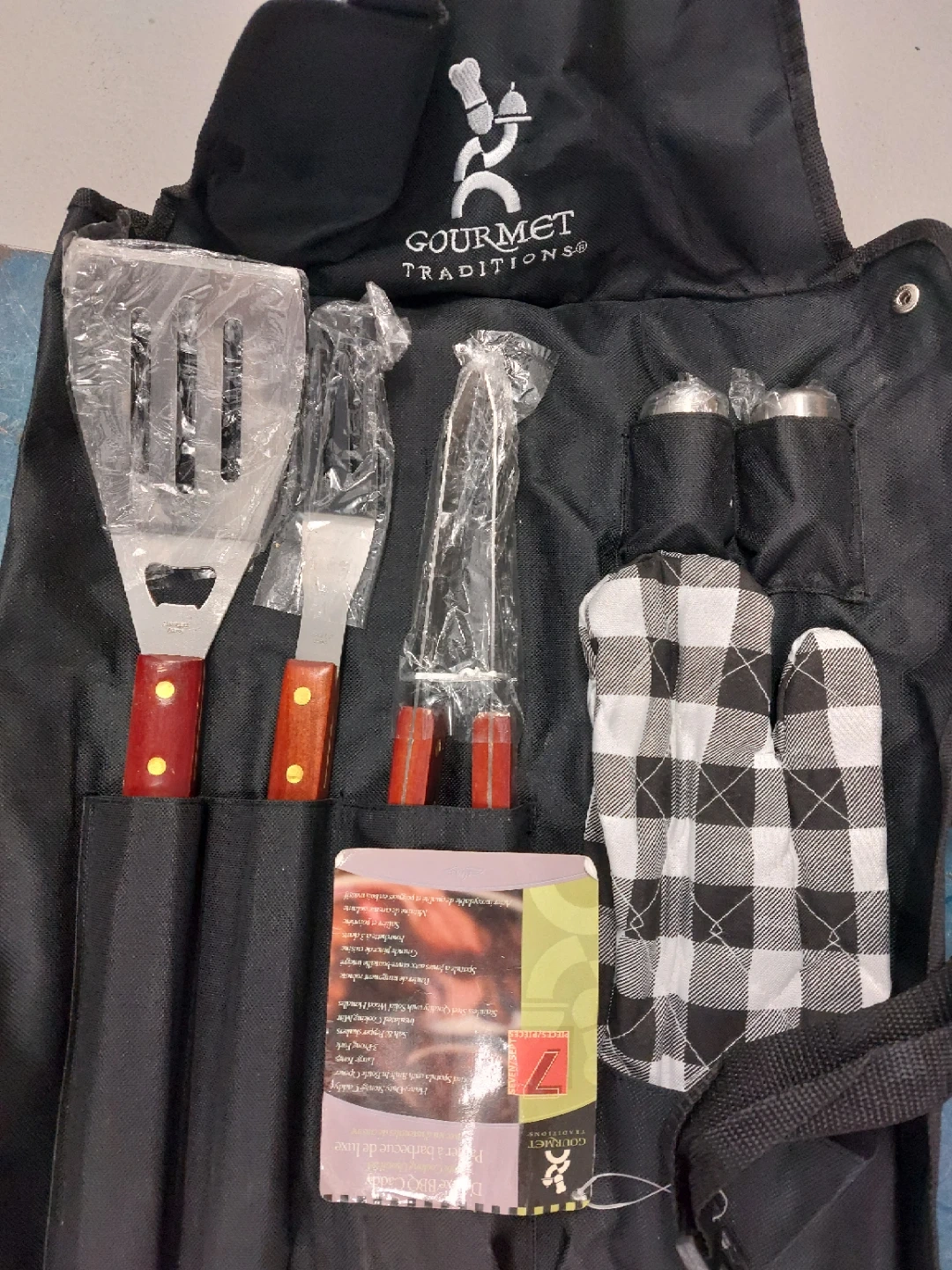 I'm selling a brand new Gourmet Traditions Deluxe BBQ Caddy Set! It includes all the essentials for your next barbecue. The set features a convenient caddy to keep everything organized and within reach. Perfect for grilling enthusiasts!
