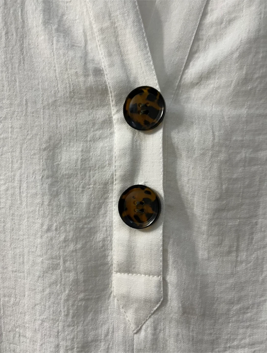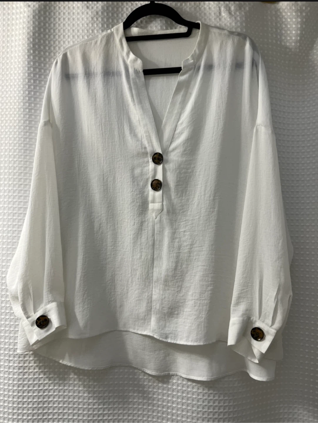 Here's a lovely white blouse with unique tortoise-shell style buttons. It's a lightweight material, perfect for warmer weather. The design features a V-neck and long sleeves with buttoned cuffs. It's in great condition and ready for a new wardrobe. Fits L