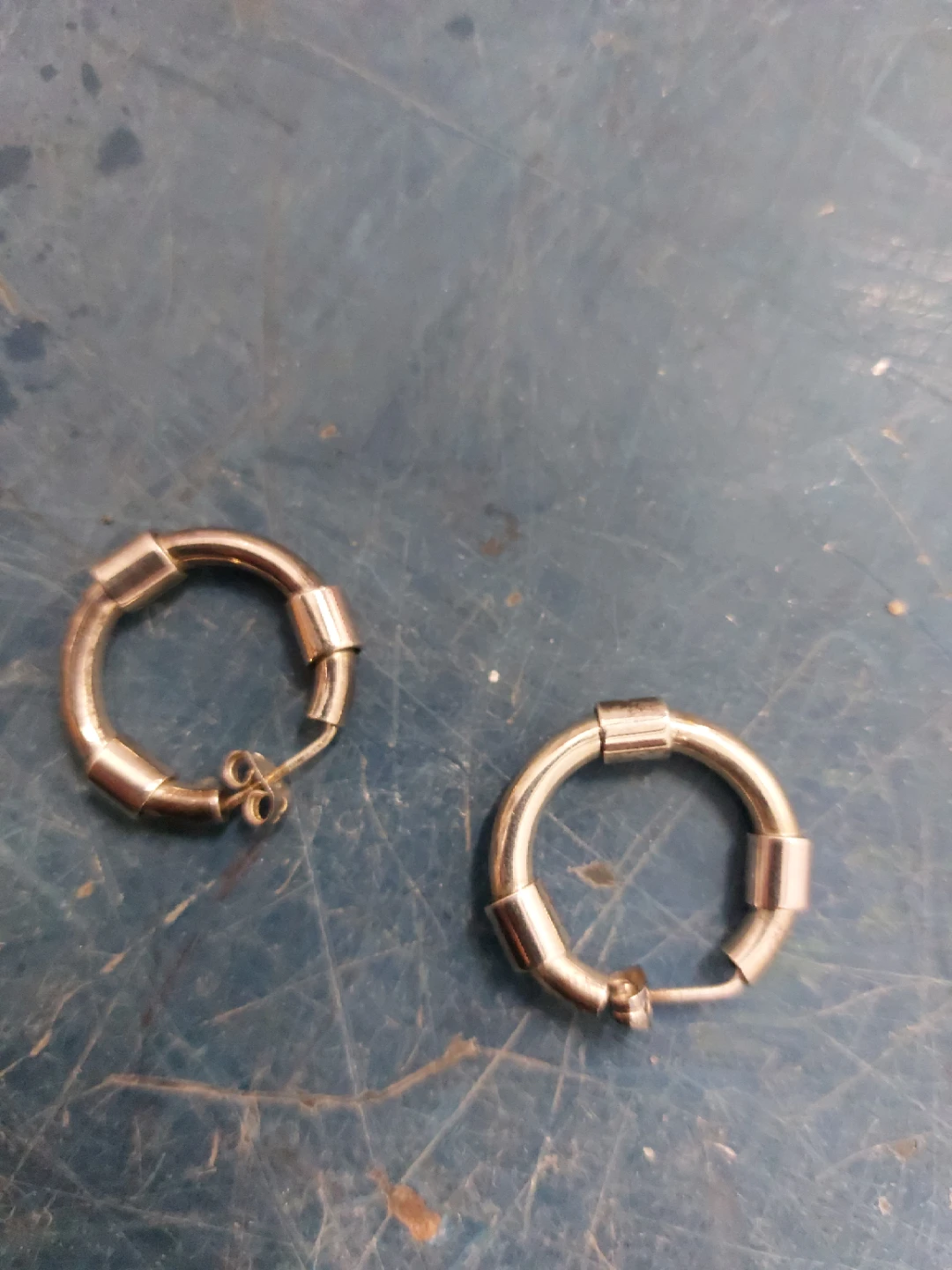 Selling a pair of silver hoop earrings. They are in good condition and have a unique design with small cylindrical accents around the hoops