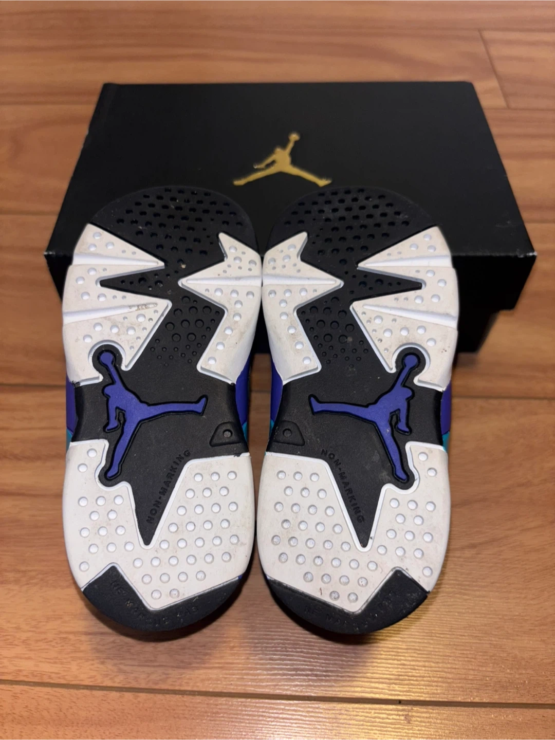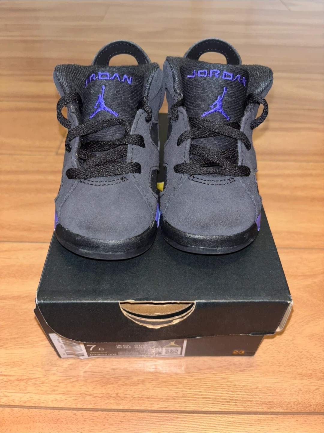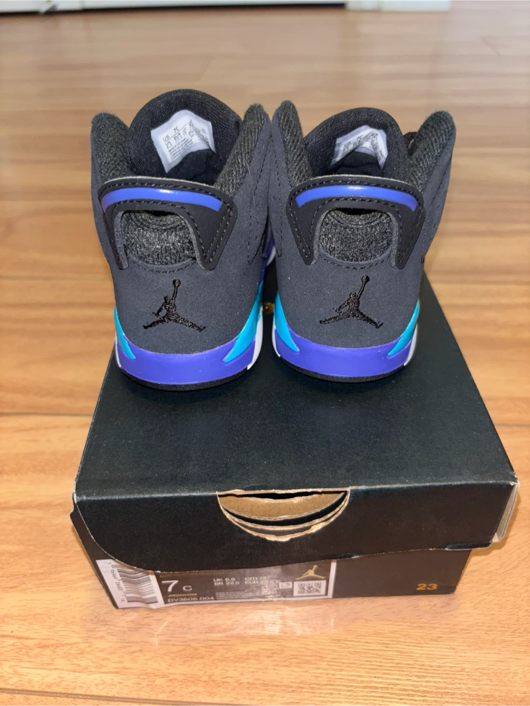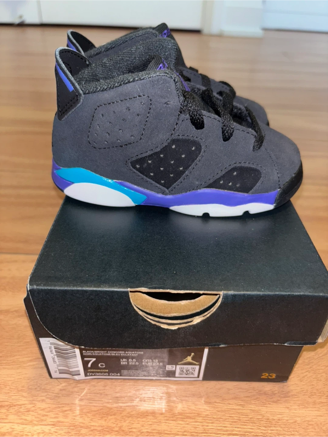 These adorable Jordan 6 toddler shoes are in great condition and come with the original box! The size is 7C. They feature a cool black, purple, and turquoise colour scheme. Perfect for your little one!