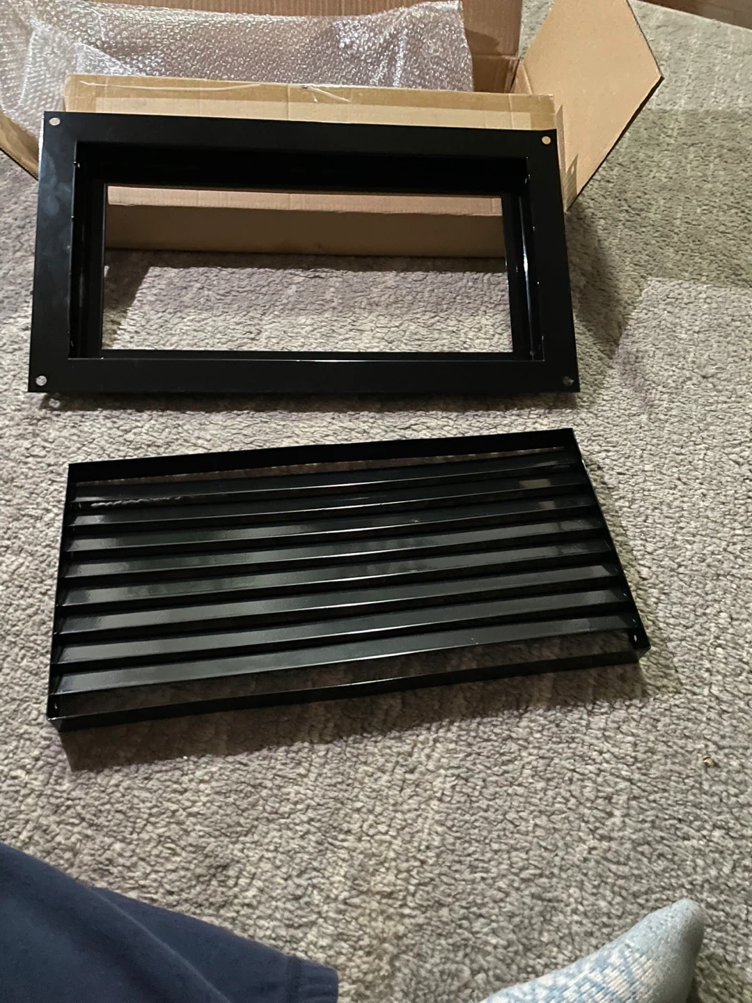 Selling a black metal over flow vent cover! It's in great condition and comes with all the necessary components and screws. The box is included as well, making it easy to transport