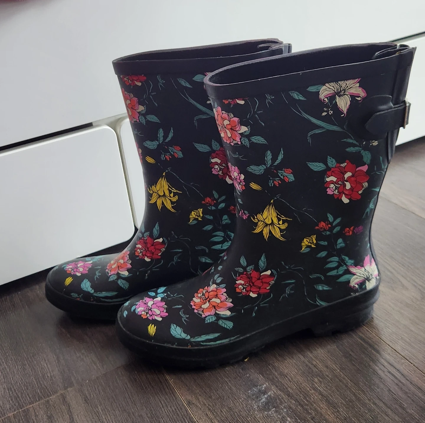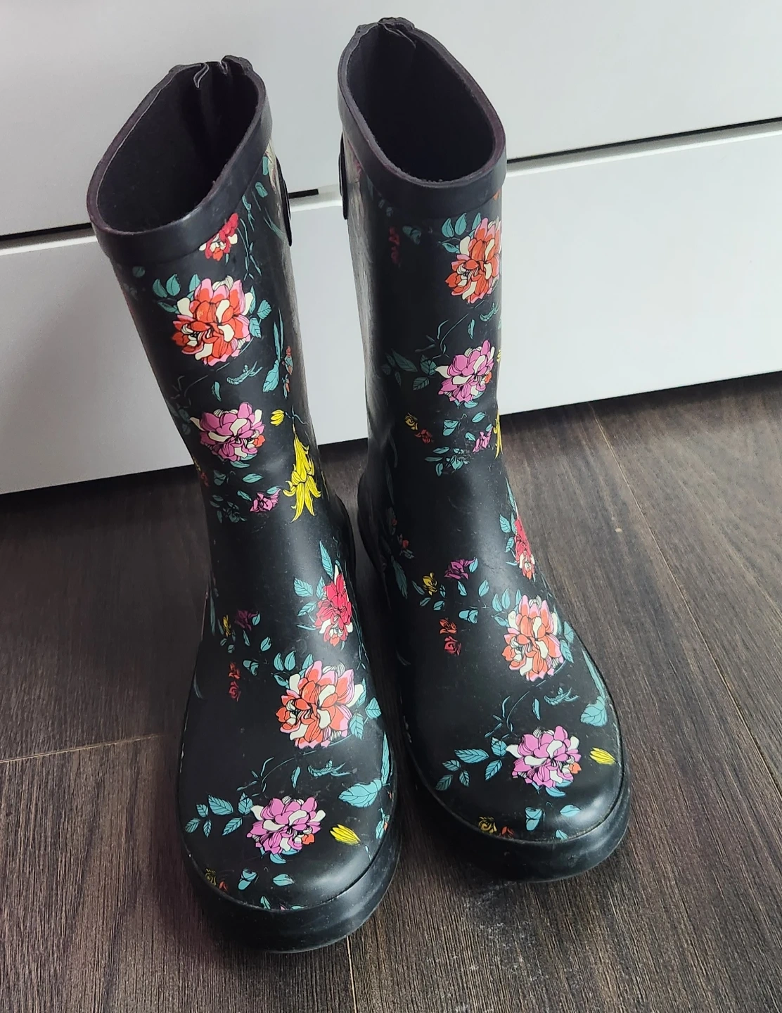 Cute rain boots with a floral pattern! These are a size 8 and in good condition, ready for some rainy day adventures