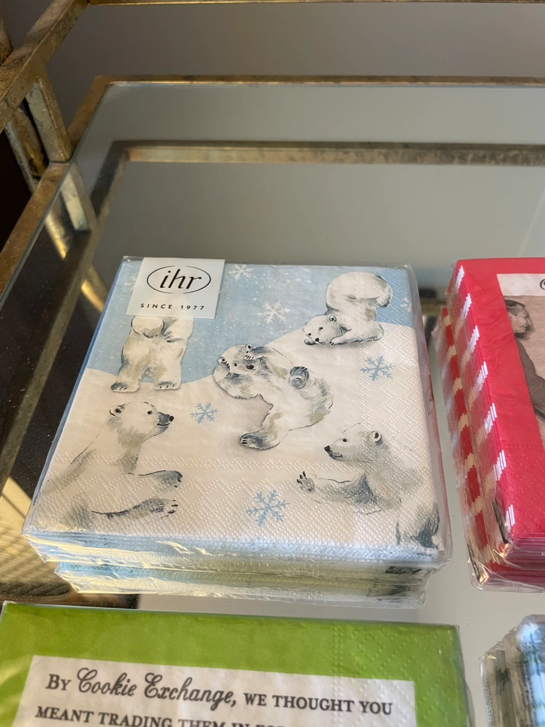 I'm selling a variety pack of IHR napkins. Each pack contains 20 napkins, 3 ply and measures 25 x 25 cm / 10 x 10 in. They are made with love in Germany. There is a pack of polar bear napkins, a pack of red polka dot napkins and a pack of green napkins with a little hearted theme and a pack of blue floral napkins. They are biodegradable and environmentally friendly.