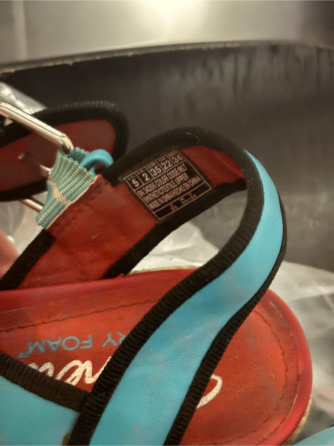 These Skechers Cali sandals are a fun pop of colour! They feature a platform sole and come in a size 5. The vibrant colour blocking makes them a unique addition to any wardrobe