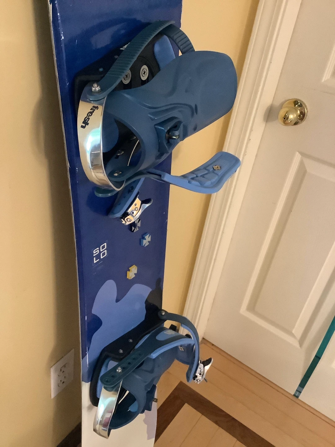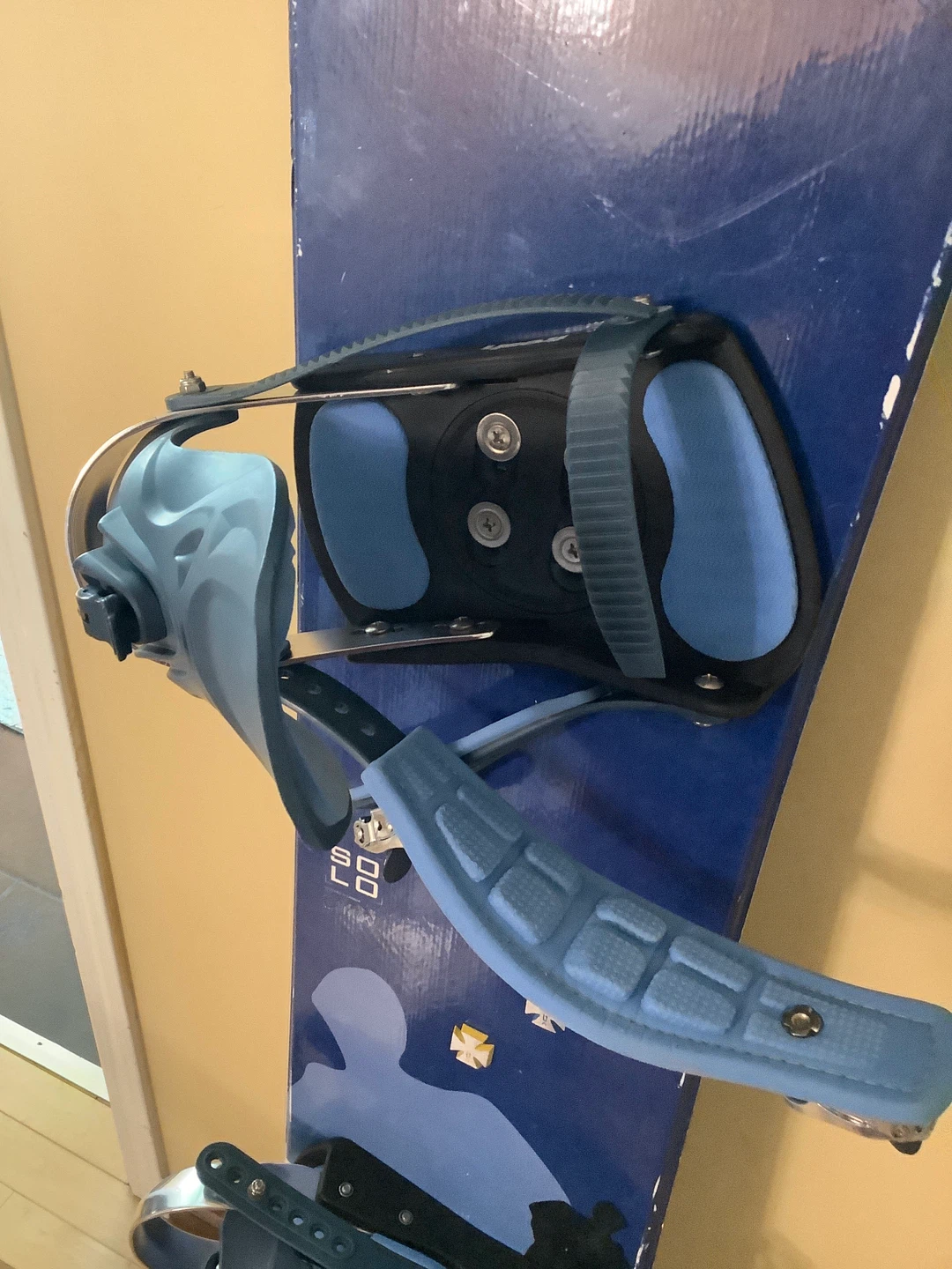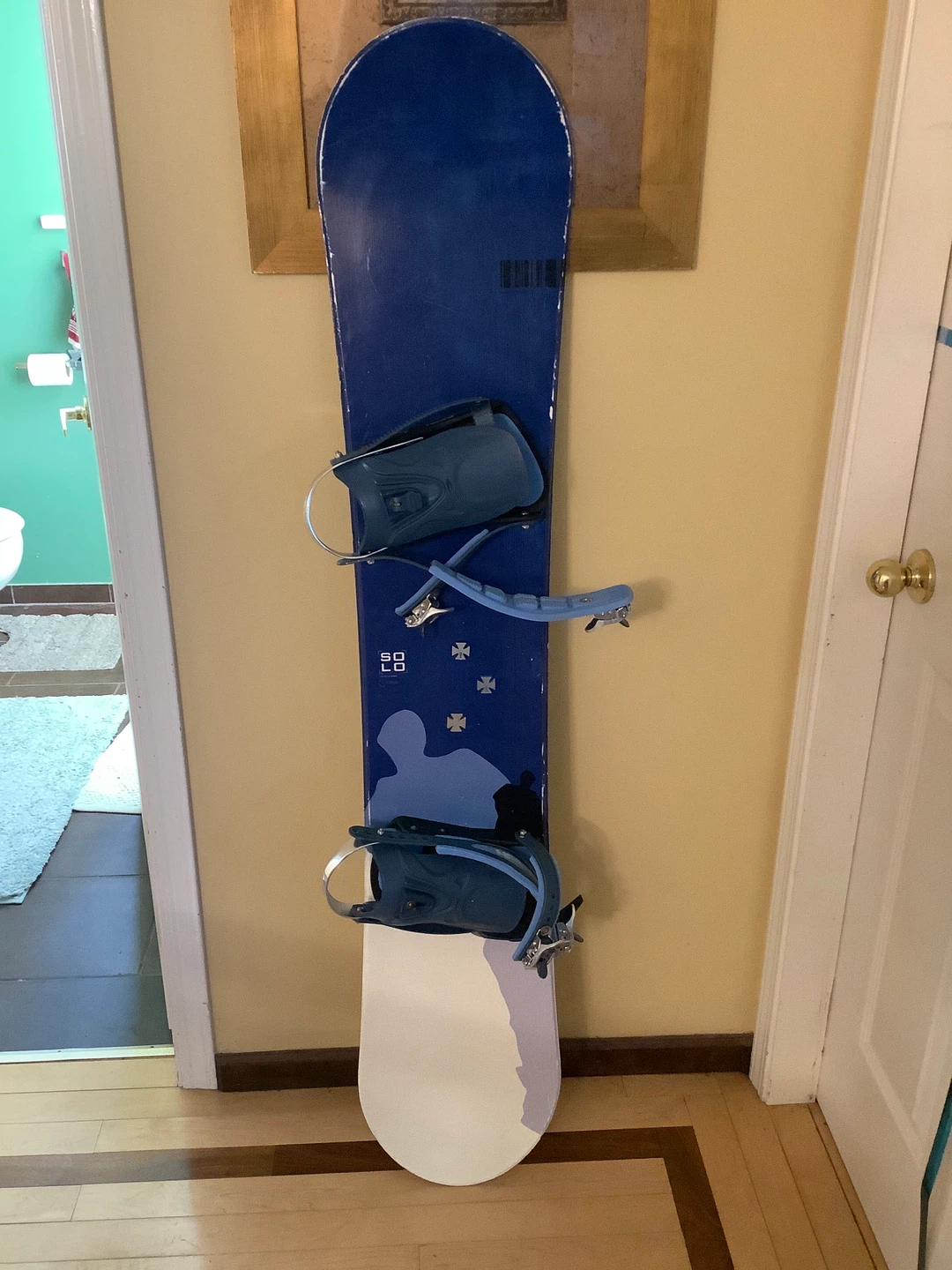 Selling a snowboard with bindings. The board features a blue and white design. Perfect for winter fun!