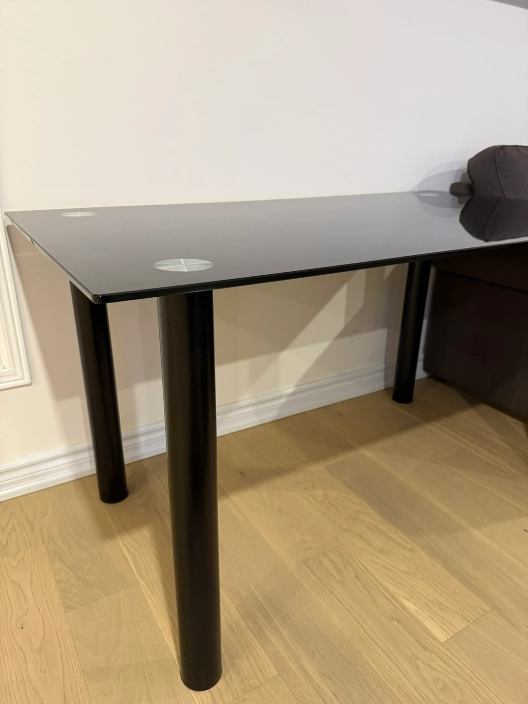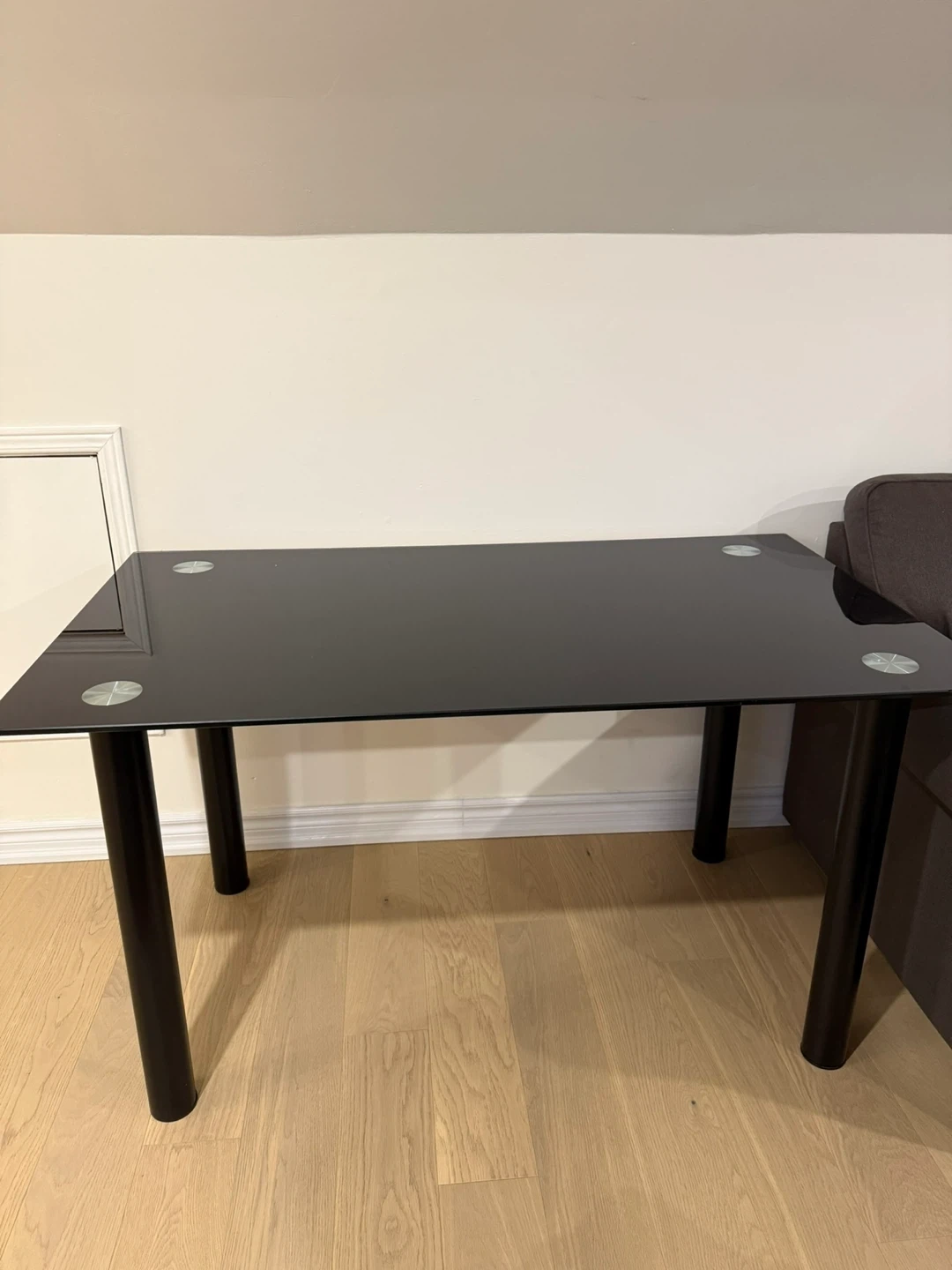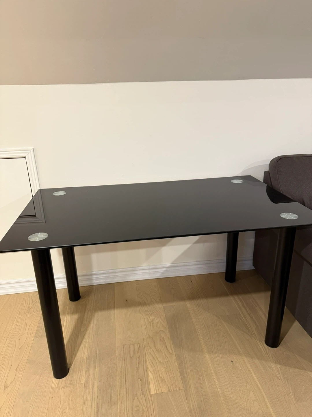 Selling a sleek black glass top dining table. It's in great condition and would be a stylish addition to any dining room or kitchen!