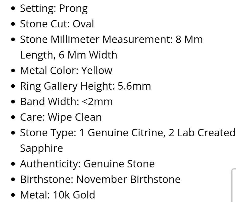 This is a beautiful gemstone ring featuring a genuine citrine stone and two lab-created sapphires. The metal is 10K gold with a yellow colour. The stone cut is oval, and the setting is prong. It is a size 7. Originally bought for $449.98. Comes with the box