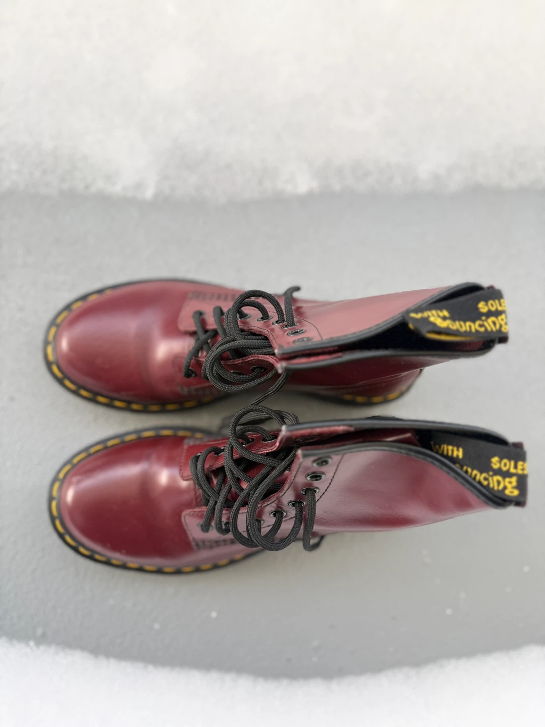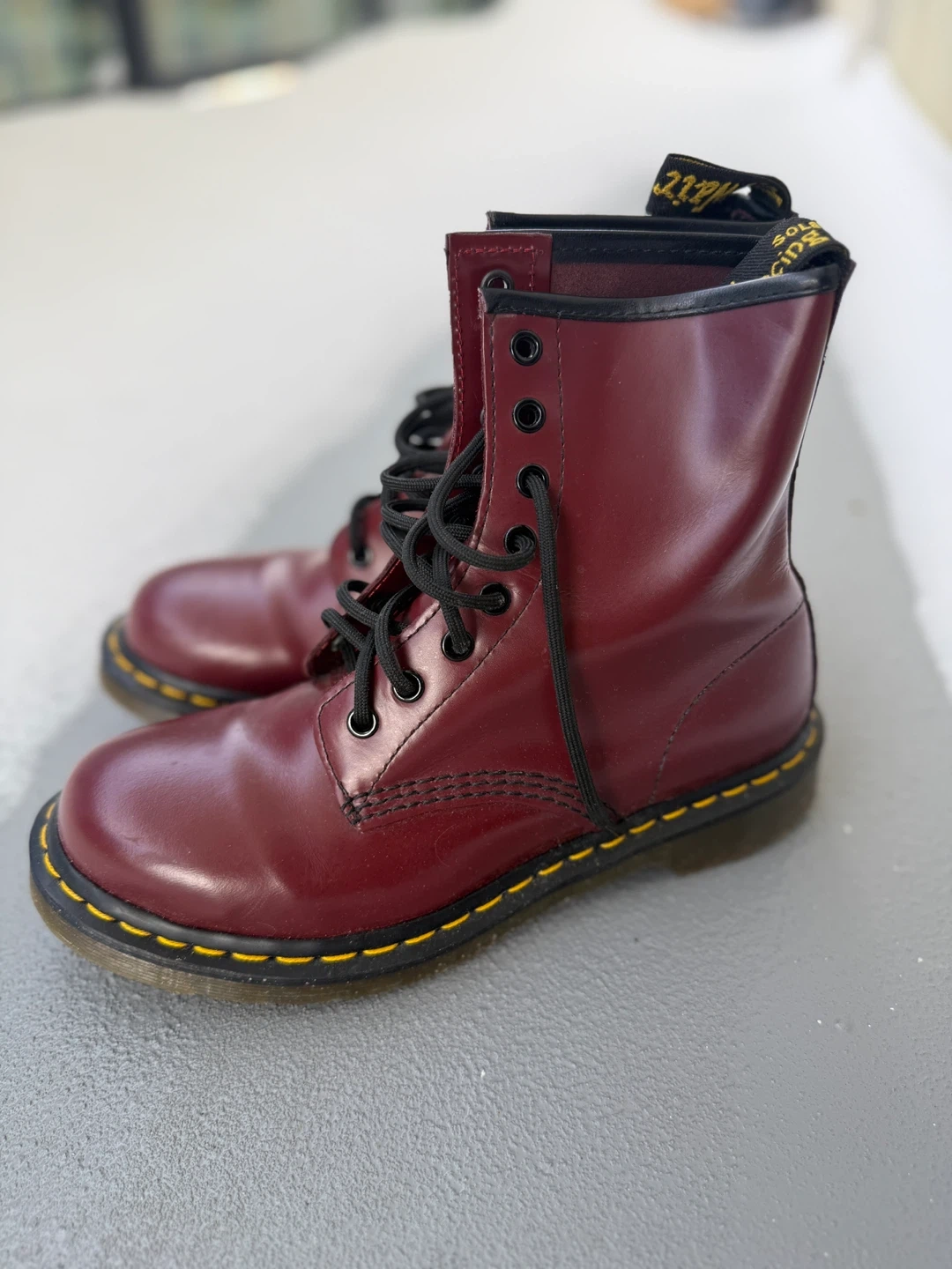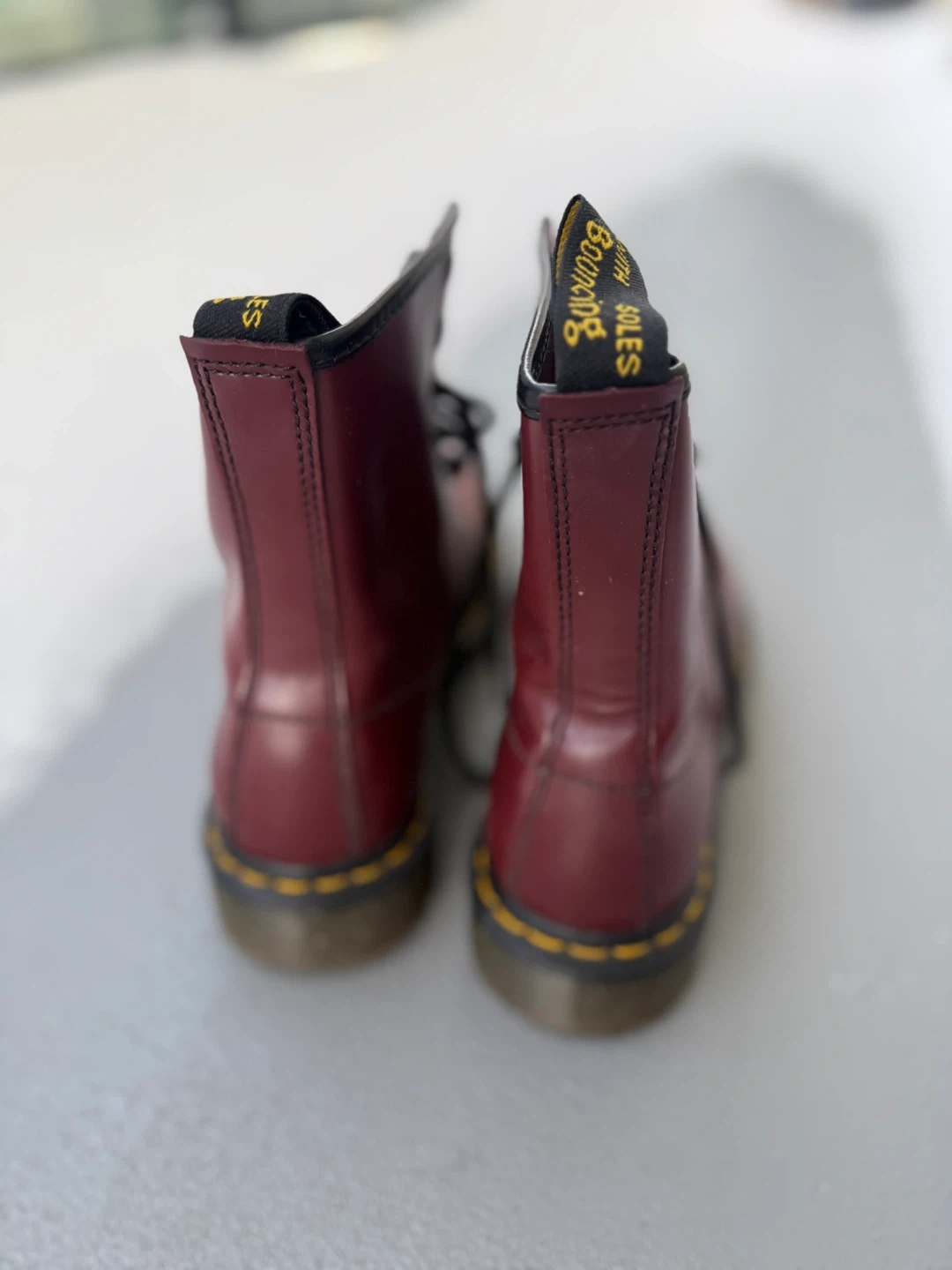 Selling my Dr. Martens 1460 Smooth Leather lace-up boots in a beautiful cherry red rouge color.