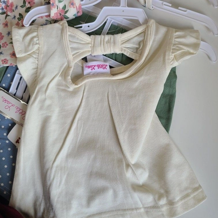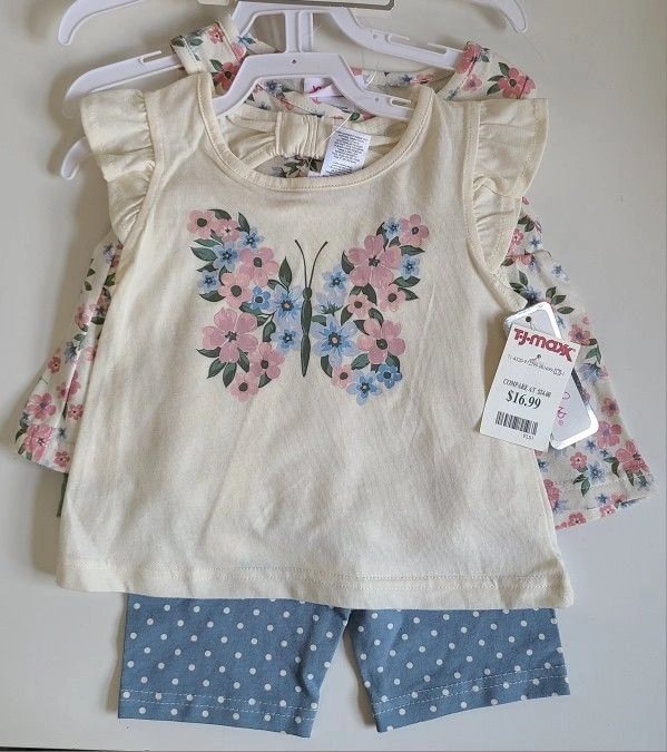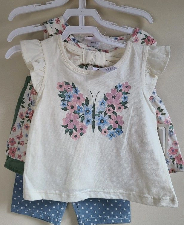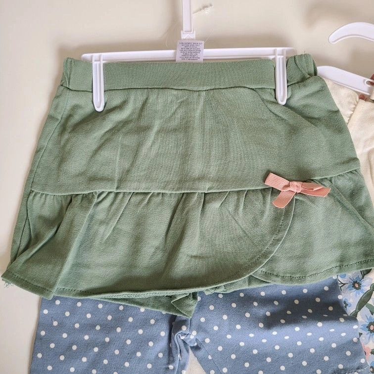 This adorable girls' outfit set includes a butterfly top, floral top, polka dot shorts, and a cute green skort. Offering a mix of playful prints and a coordinated look. New, never used, with tags. Comes from a smoke free, pet free home.