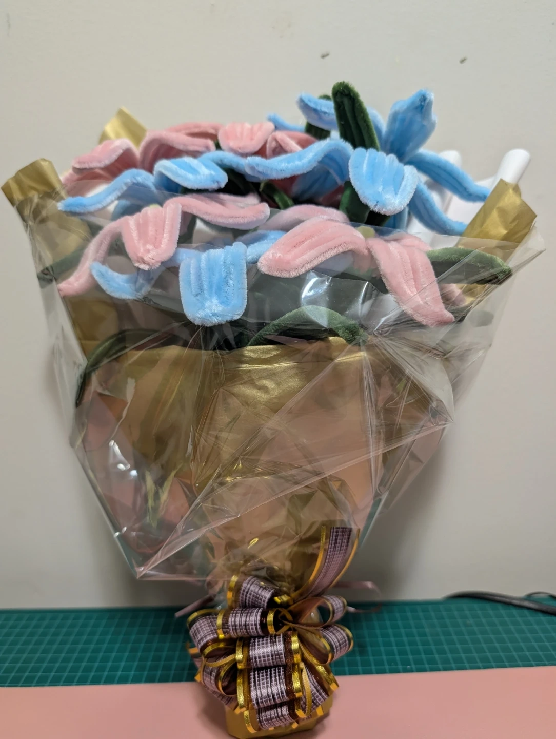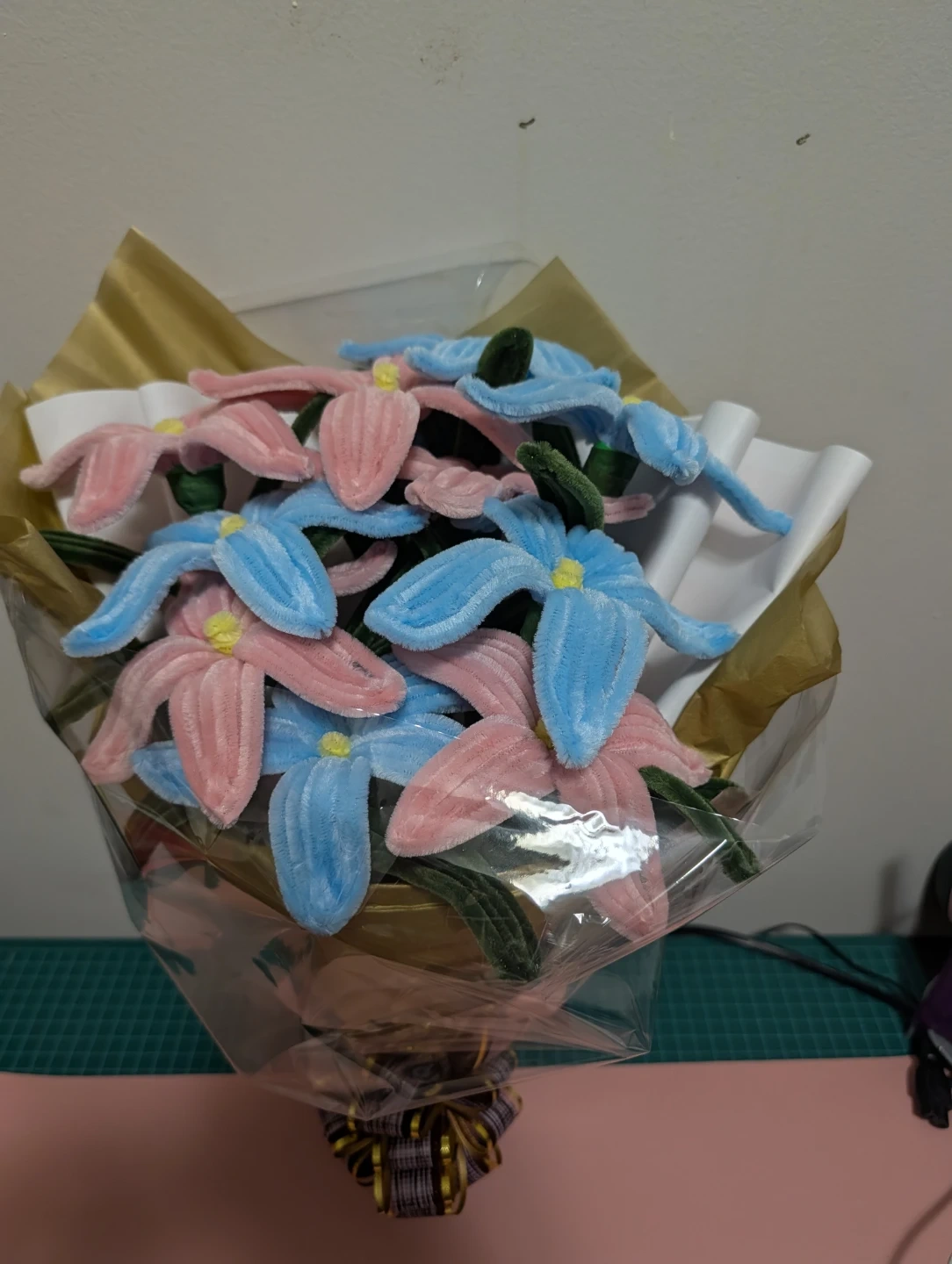 Selling a cute, handmade flower bouquet made from pink and blue pipe cleaners! It's a unique and charming piece that would brighten up any space. Perfect as a gift or a decorative item for your home