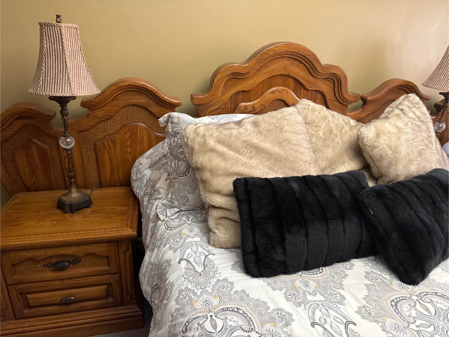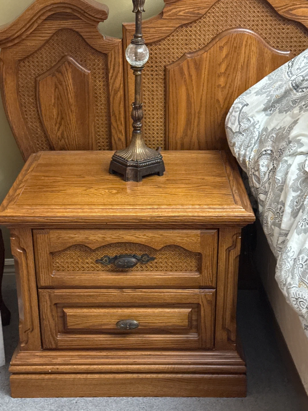 Selling a beautiful oak bedroom set! Includes a large armoire, a bed frame, a nightstand, and a dresser with a triple mirror. All pieces feature a lovely oak finish and intricate detailing. Perfect for adding a touch of classic elegance to your bedroom
