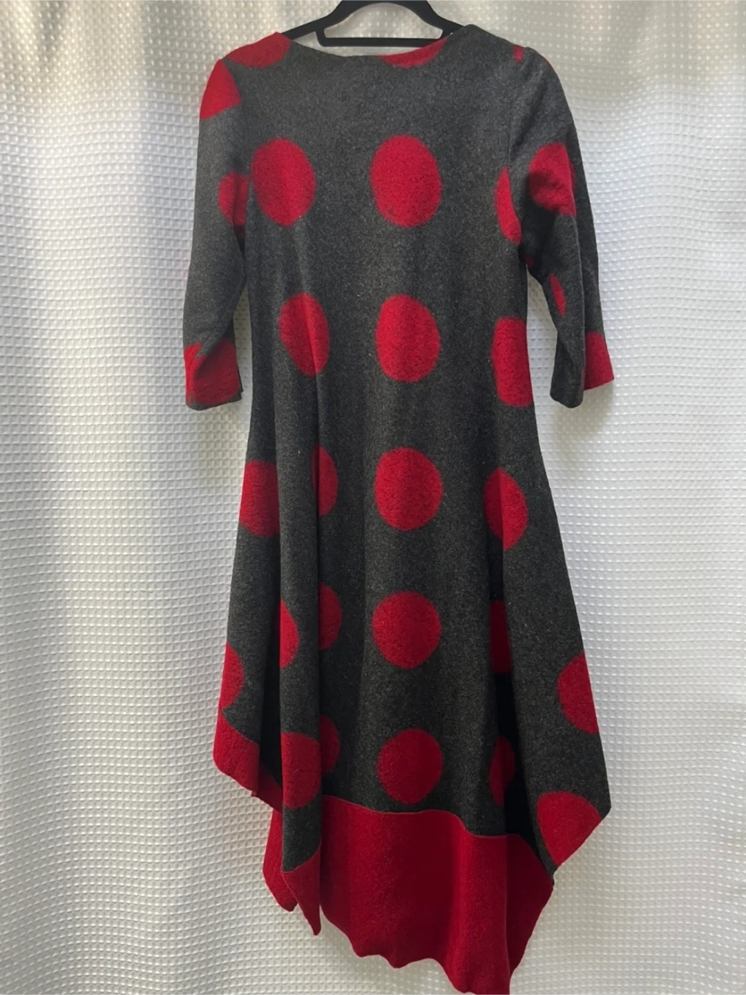 This is a Julitta Design Studio dress, made of 100% laine (wool). It features a unique polka dot pattern in red and gray. It's a size small but can fit M in great condition! Never worn, brand new!