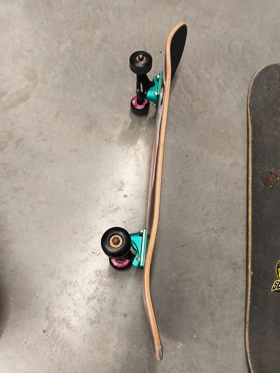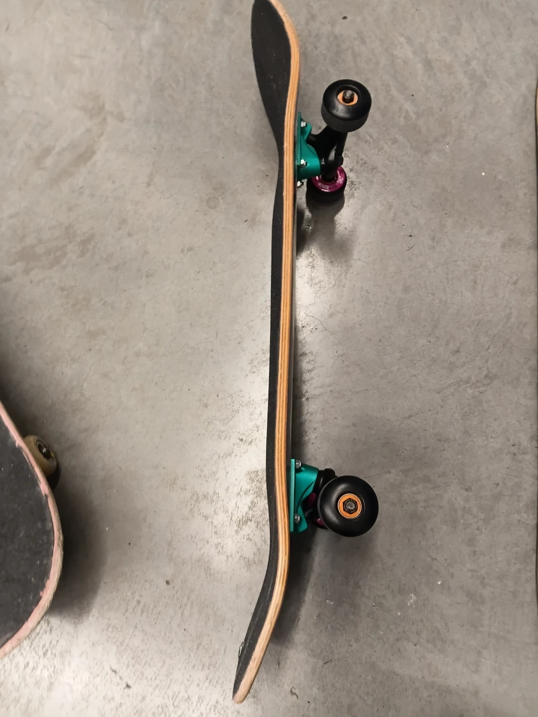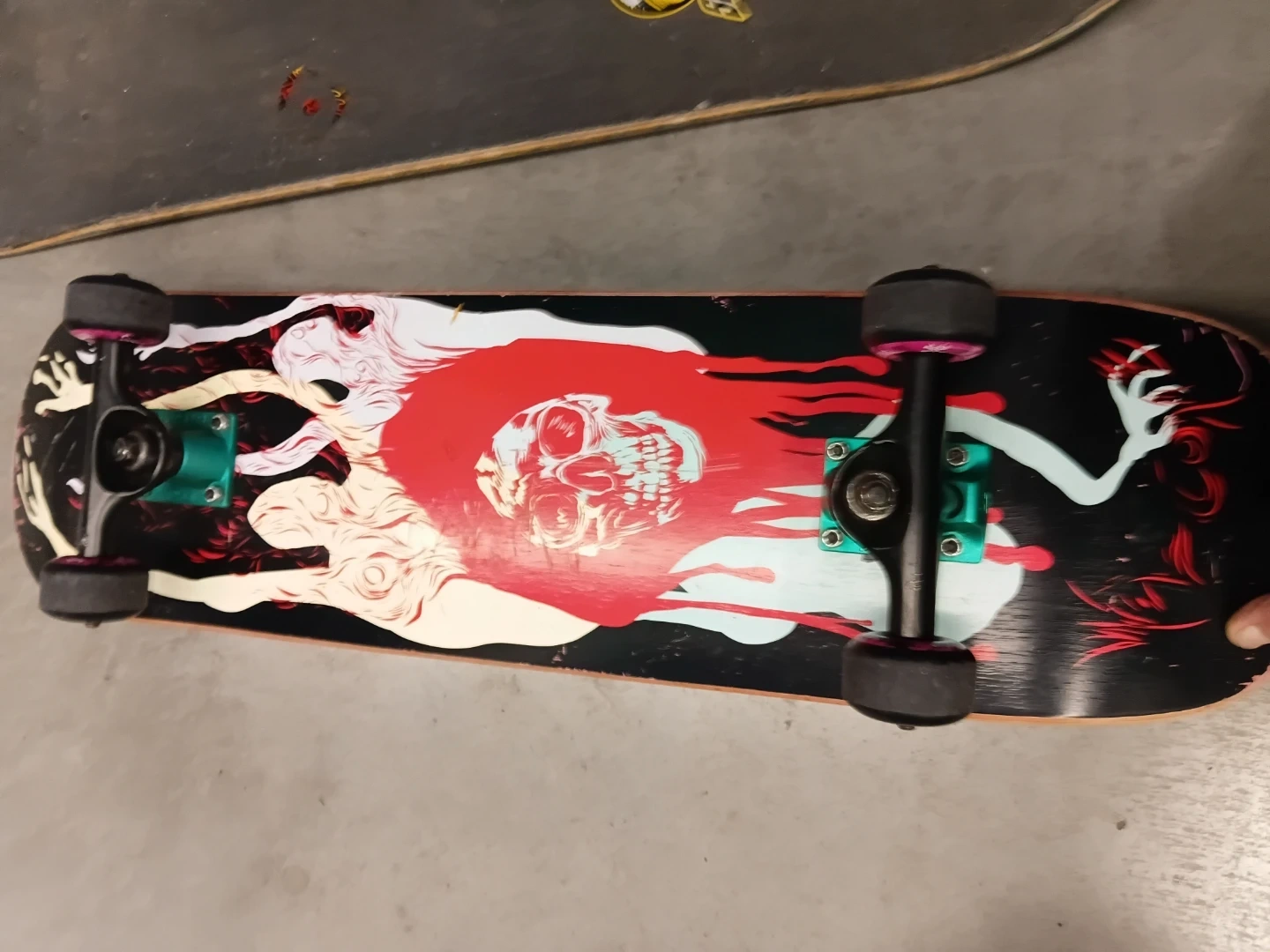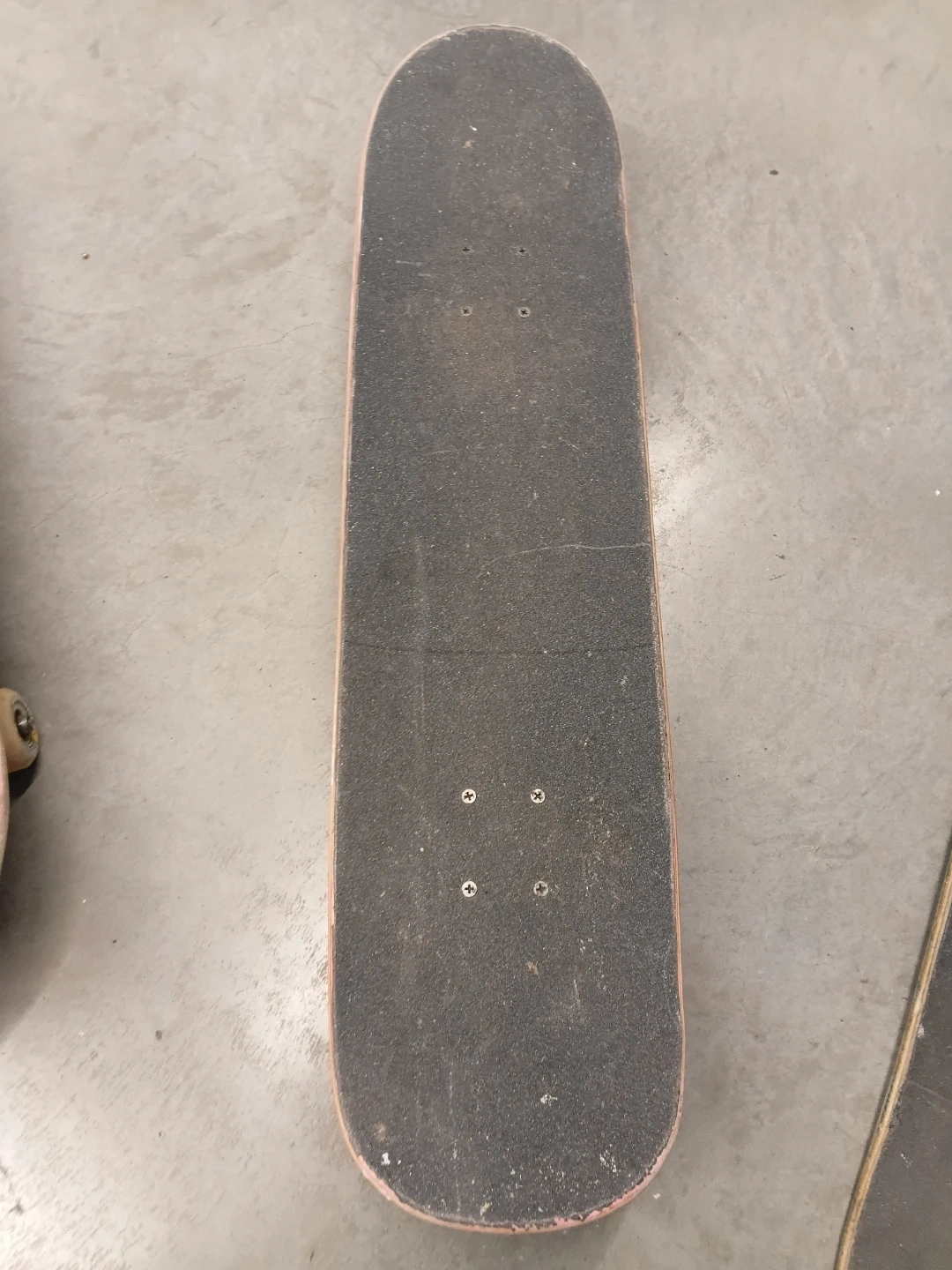 Selling a used skateboard. It has a cool graphic on the bottom and looks like it's ready to ride. The wheels and trucks seem to be in good shape. Great for someone looking to get into skateboarding or needs a spare board