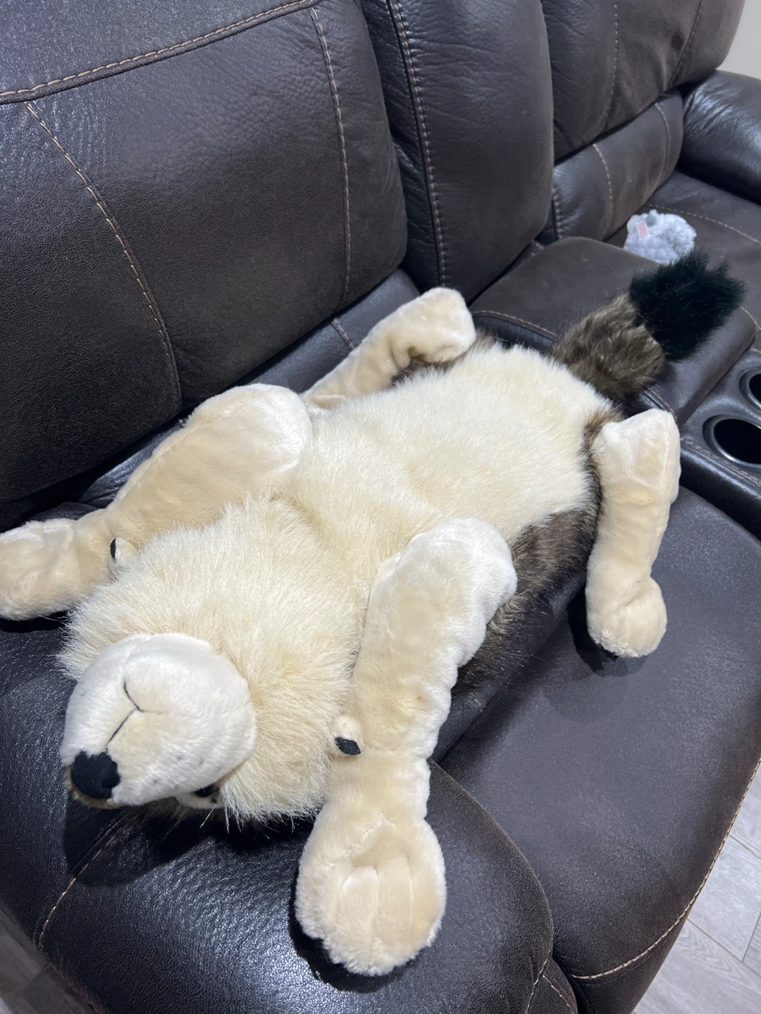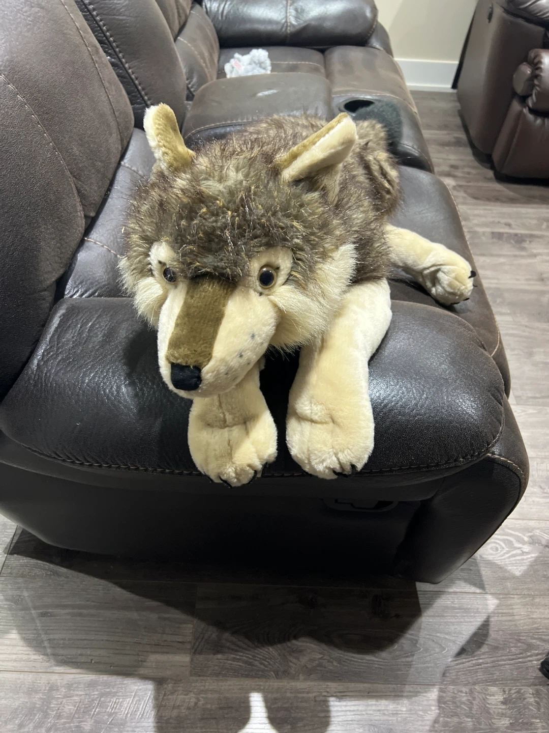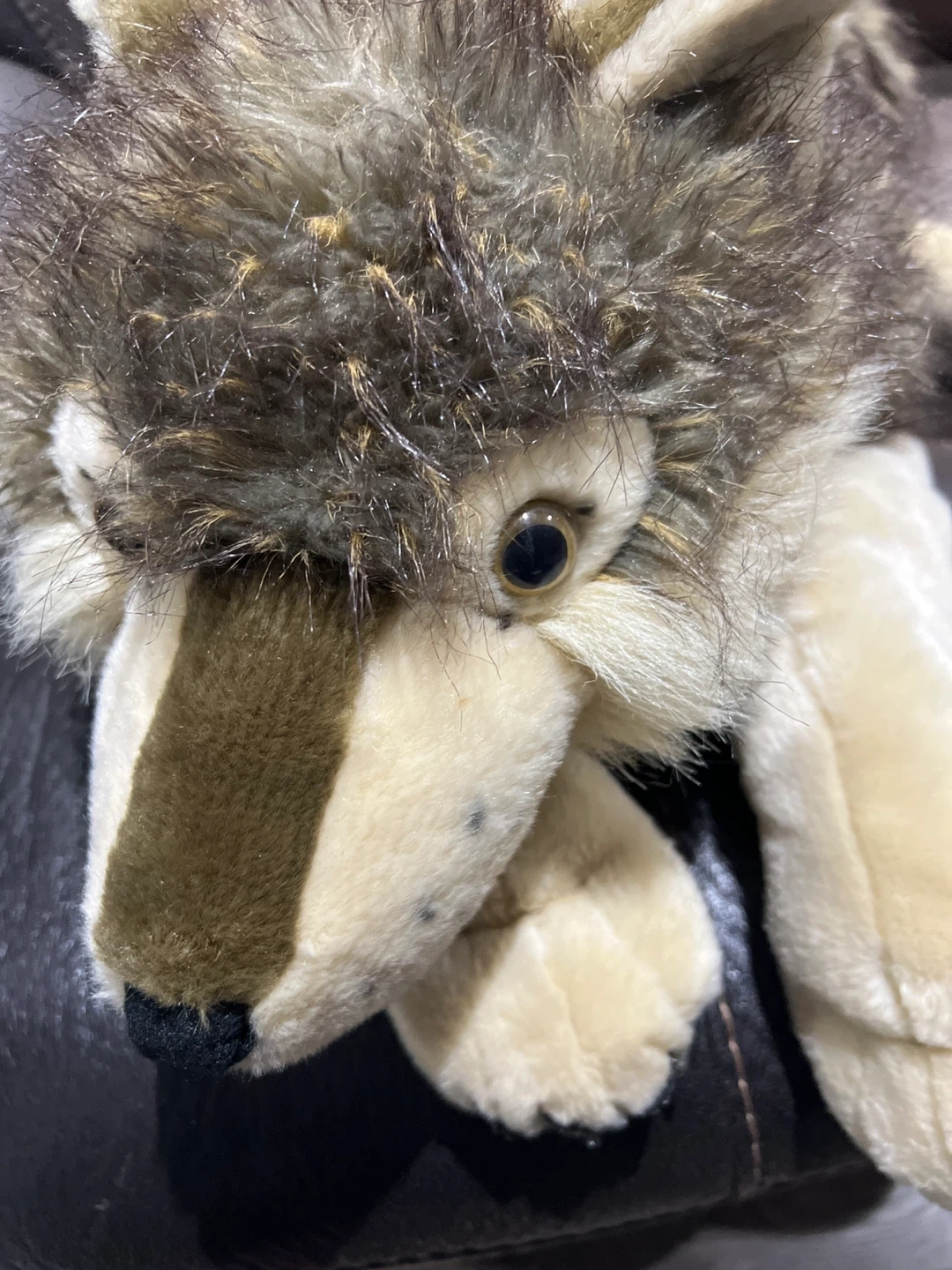 Selling a cuddly wolf plush toy! It's in great condition and ready for a new home with someone who loves stuffed animals. It has a fluffy tail and soft fur, perfect for snuggling up with on the couch
