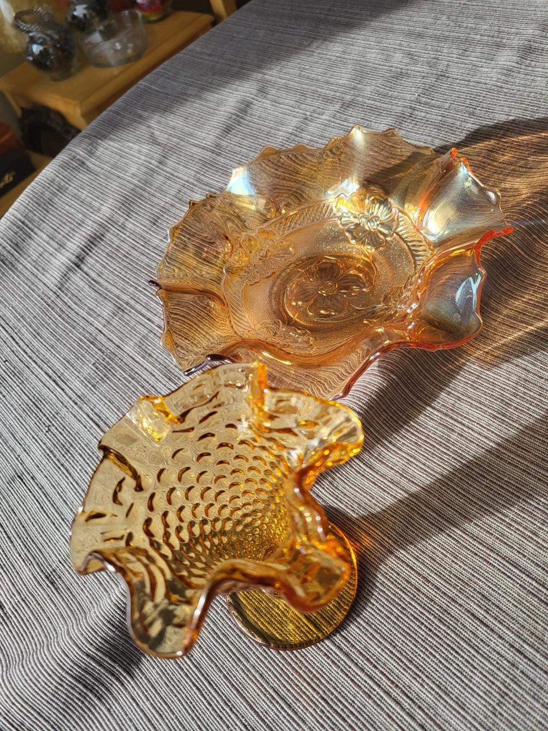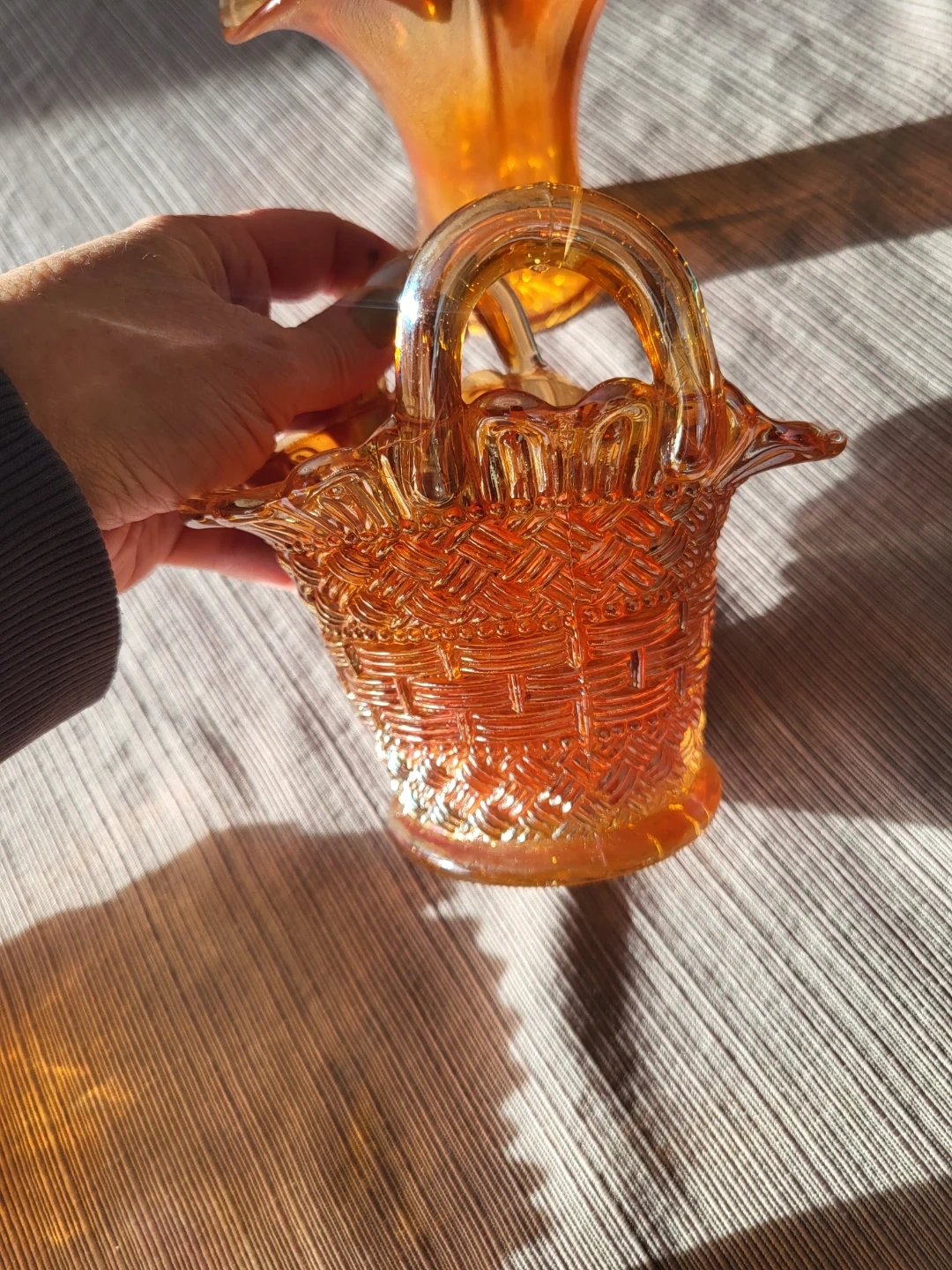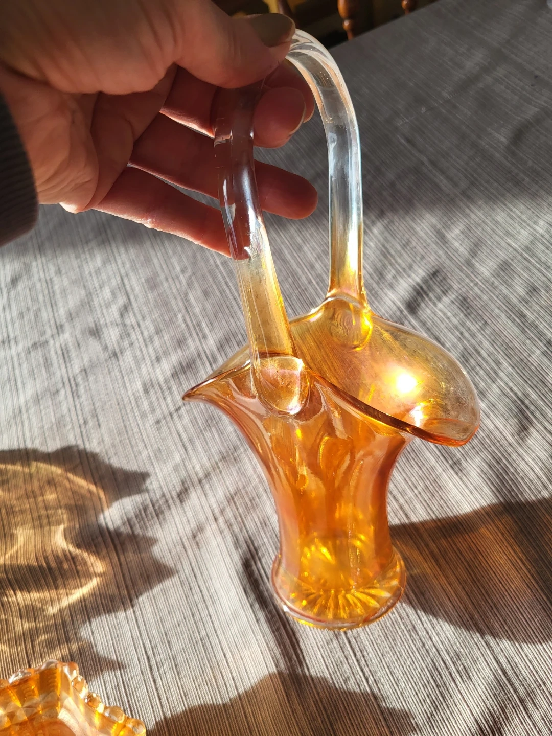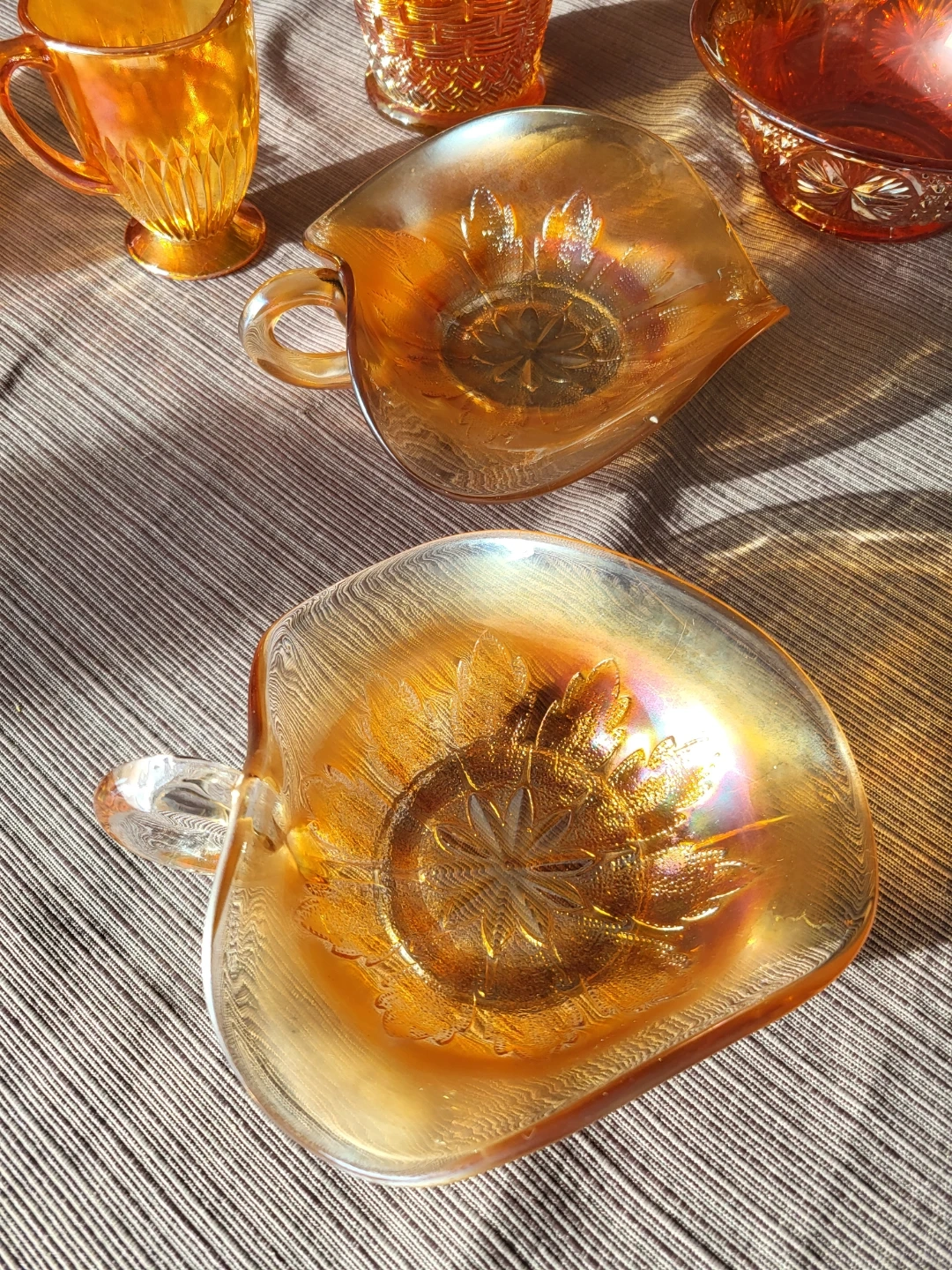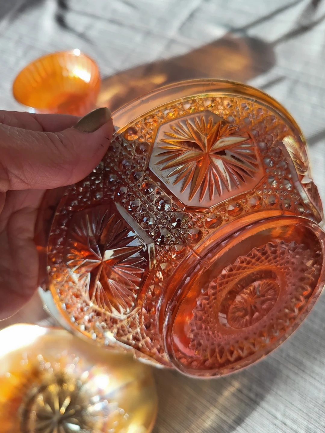 Selling a beautiful collection of vintage carnival glass pieces! This set includes various bowls, a basket, and a small pitcher, all in a lovely iridescent orange colour. These pieces would be a great addition to any collection or as unique home decor